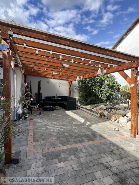 Az udvaron helyett kapott egy fa szerkezetű, fedett pergola, mely a mindennapok és a társas összejövetelek kényelmét szolgála.