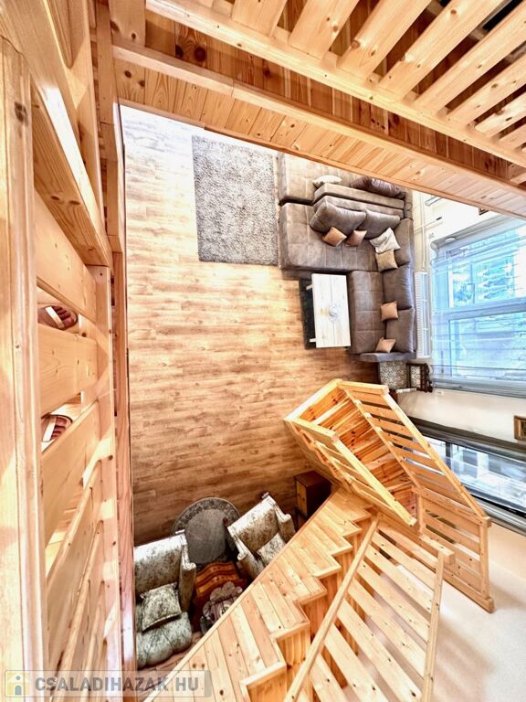 -a falak is kővel / fával burkoltak, a lépcső , a galéria és a beltéri ajtók újszerűek,