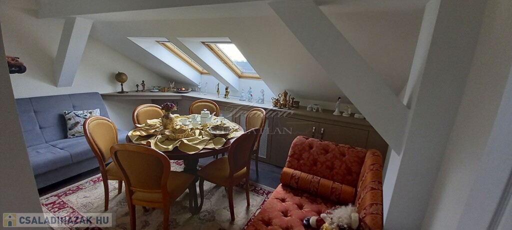 Az emeleti szint a hátsó terasz irányából is megközelíthető, itt egy étkezős konyha (még nem használt, vadonatúj konyha, felső kategóriás gépekkel) , egy fürdőszoba, valamint 2 szoba található, amelyből az egyik szoba nappaliként a másik pedig egy saját erkéllyel rendelkező hálószobaként funkcionál. A tetőtérben további két kellemes méretű hálószoba, a háztartási helyiség és a harmadik fürdőszoba található.
