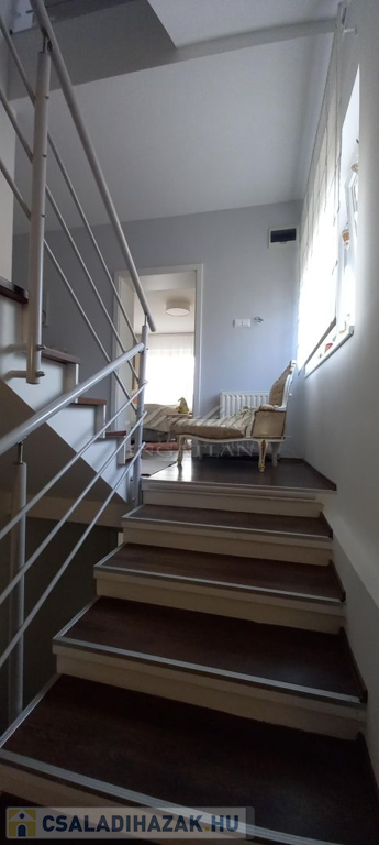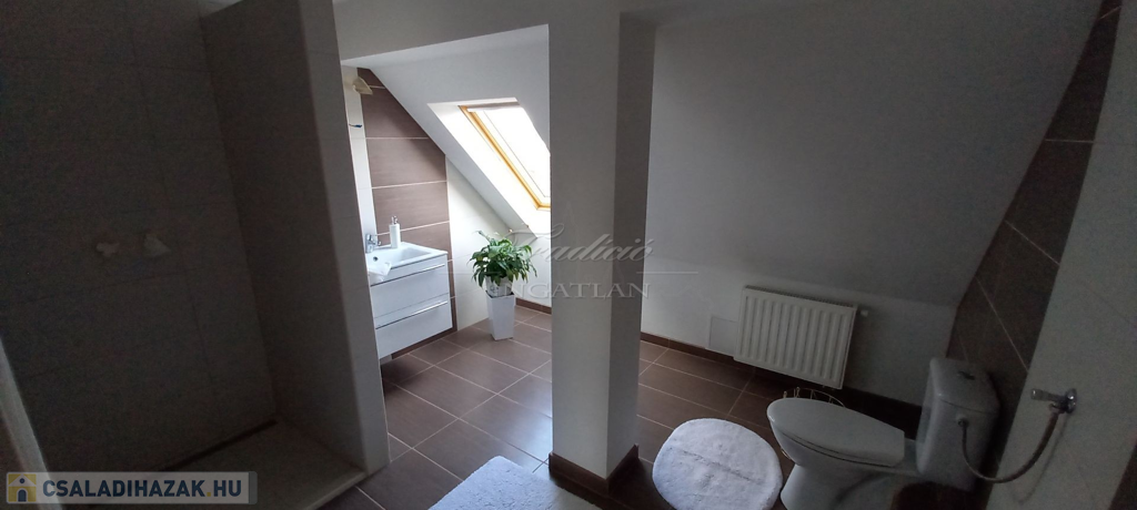 Az emeleti szint a hátsó terasz irányából is megközelíthető, itt egy étkezős konyha (még nem használt, vadonatúj konyha, felsőkategóriás gépekkel) , egy fürdőszoba, valamint 2 szoba található, amelyből az egyik szoba nappaliként a másik pedig egy saját erkéllyel rendelkező hálószobaként funkcionál. A tetőtérben további két kellemes méretű hálószoba, a háztartási helyiség és a harmadik fürdőszoba található.