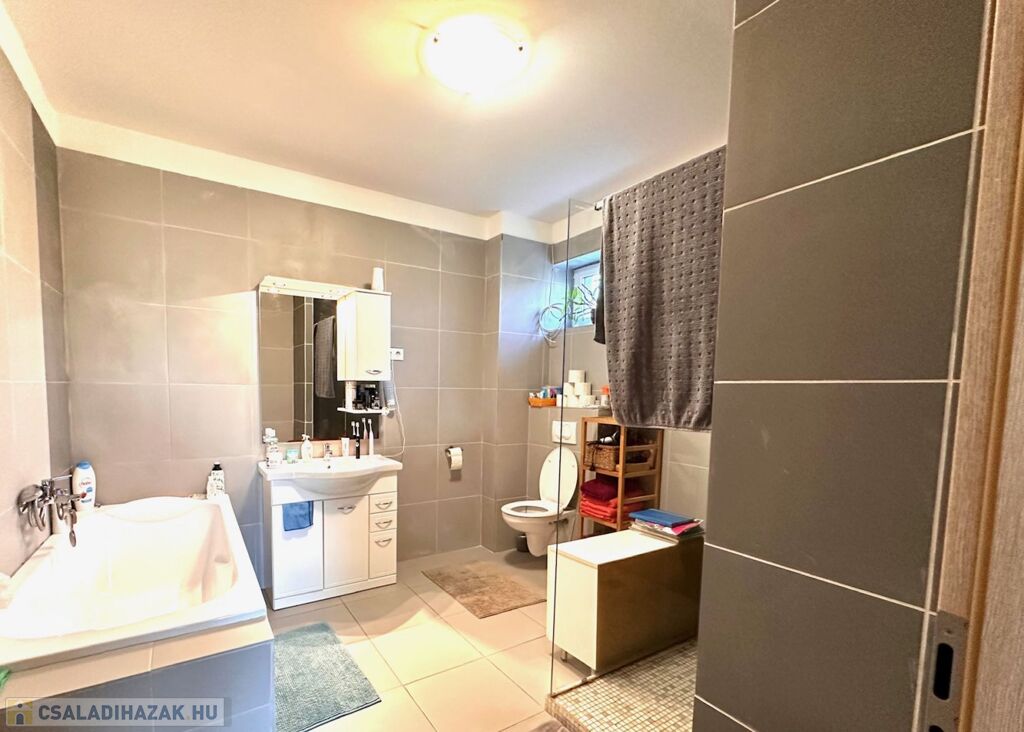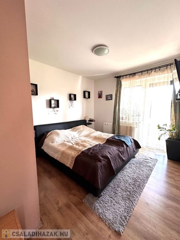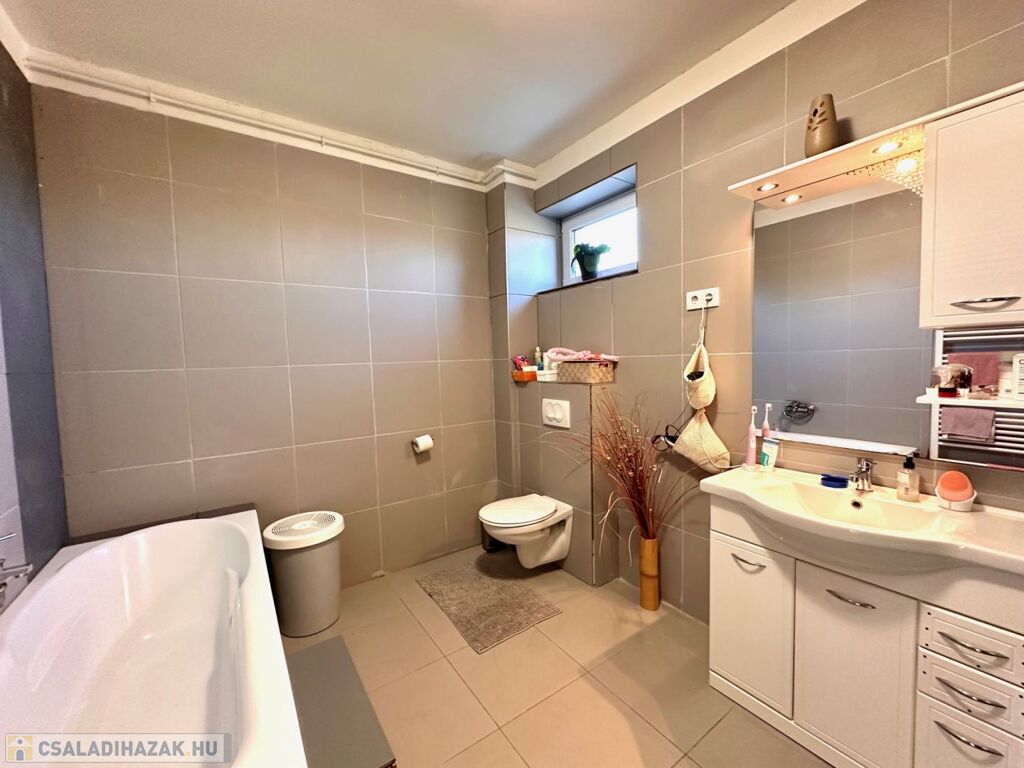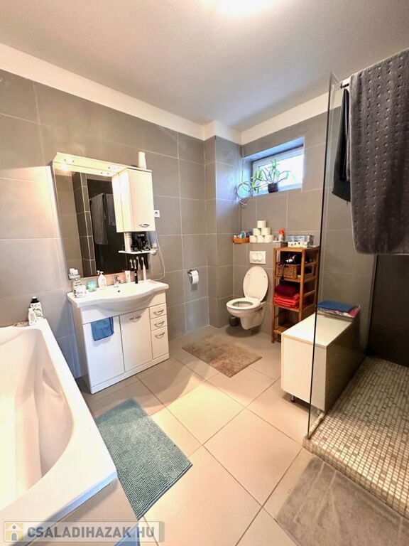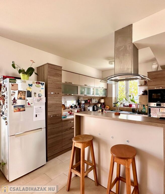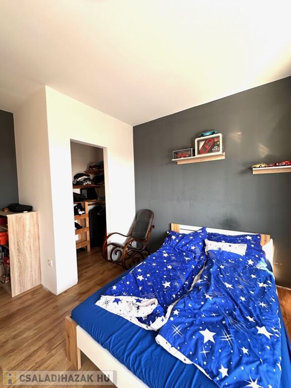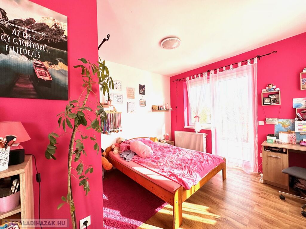 A földszinti lakószint:- nappali és konyha étkező, valamint szülői háló, gardrób és fürdőszoba teszi teljessé a magánszférát!! Az emelet a gyerekek birodalma!