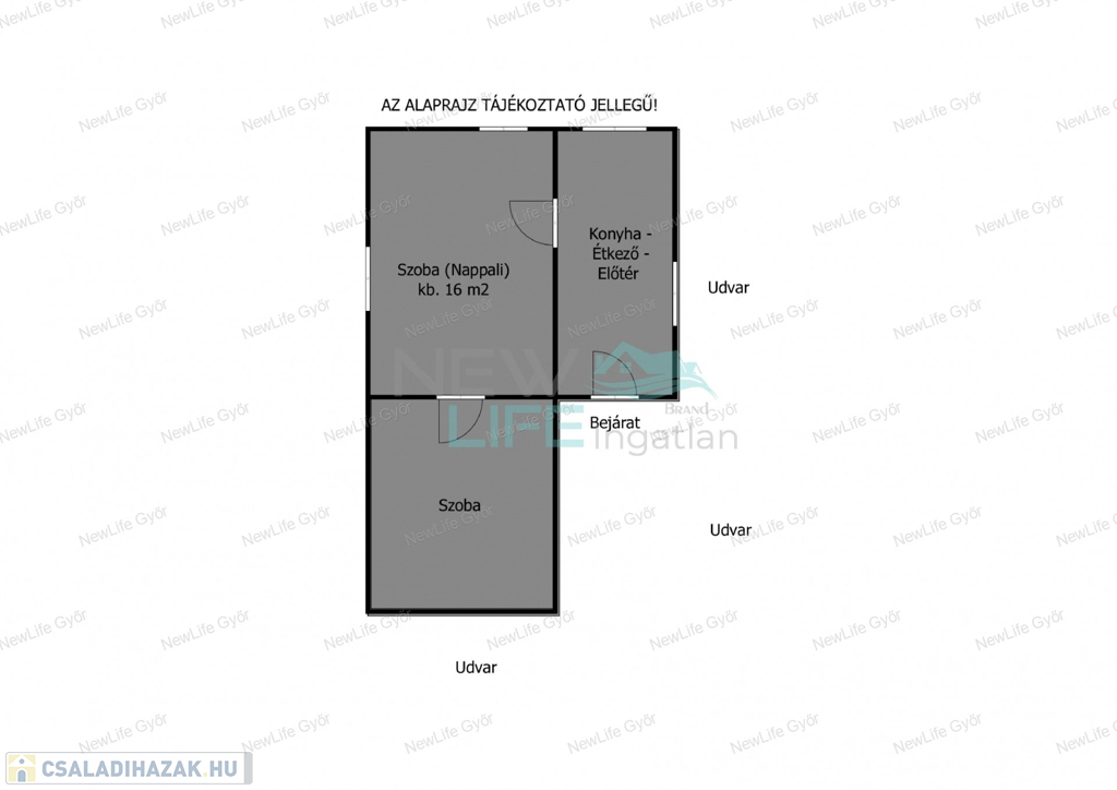 - 38 m2 – es téglaépület elosztása: konyha – étkező – előtér [kb. 10 m2], szoba [kb.12 m2], szoba –„nappali” [kb. 16 m2]