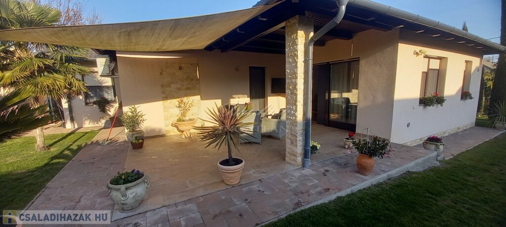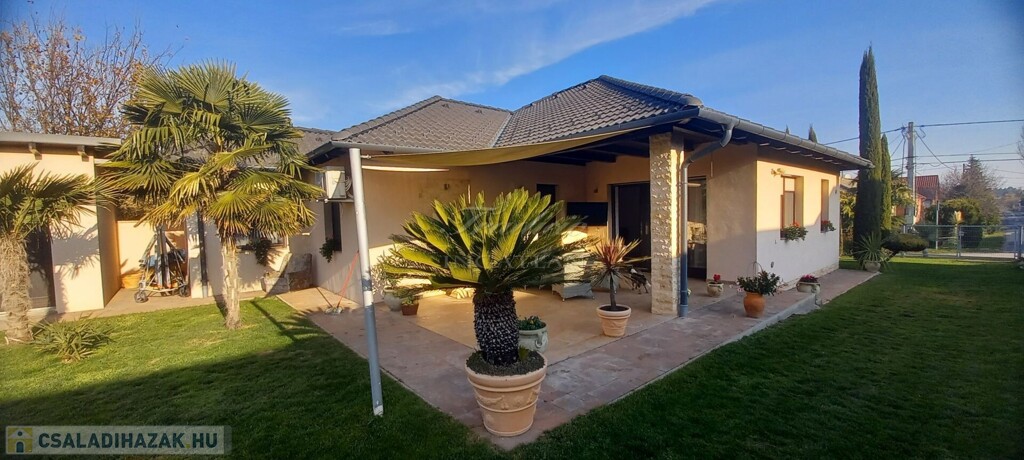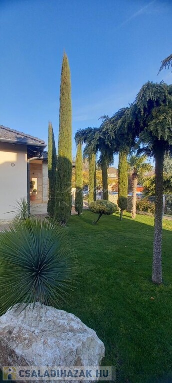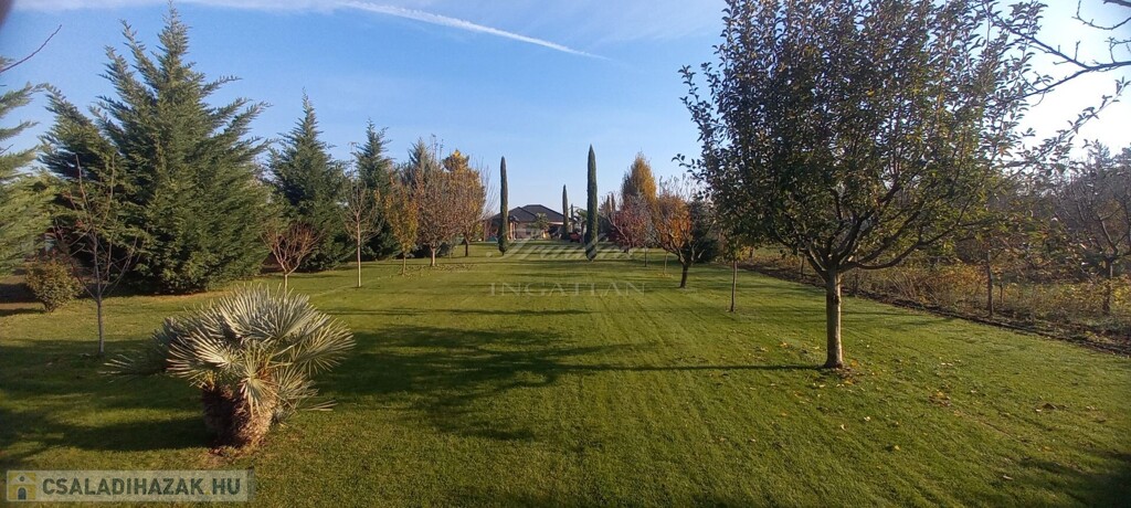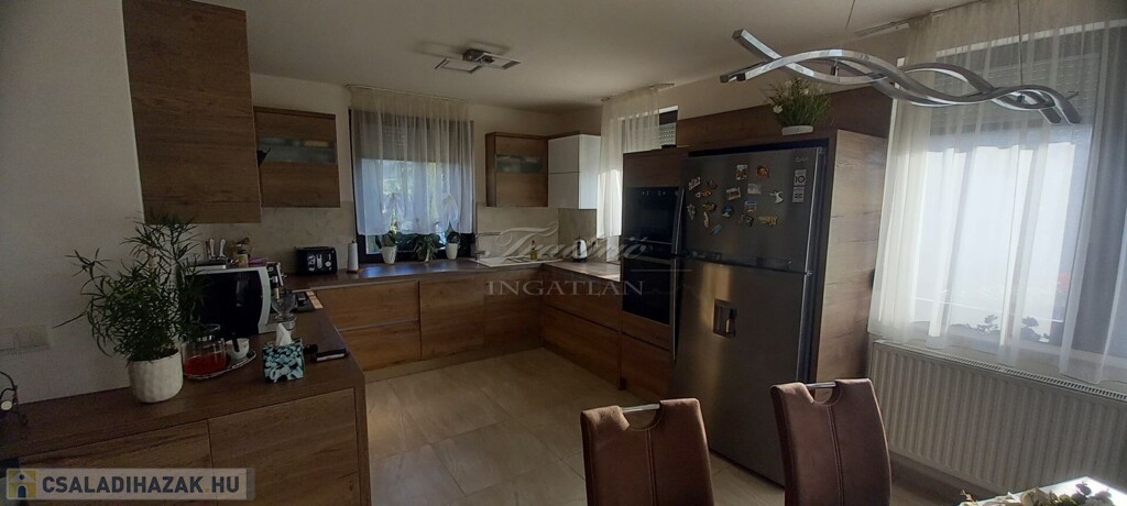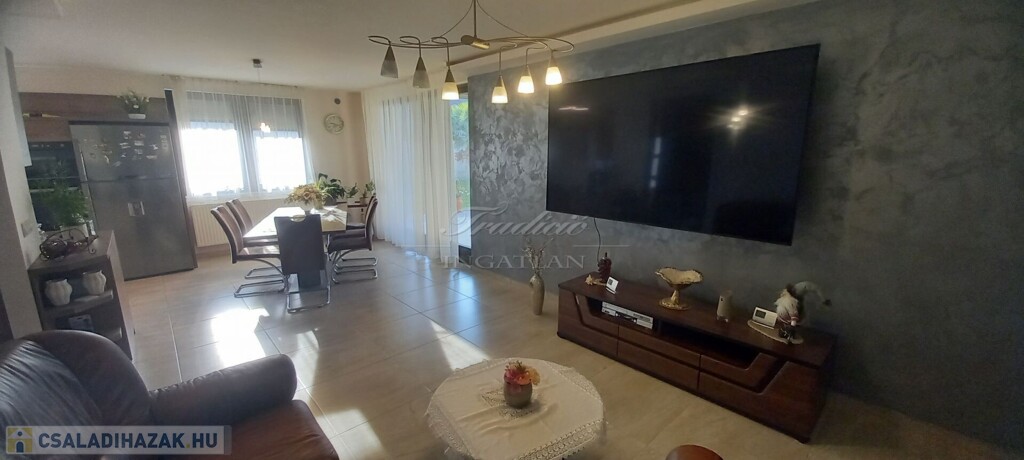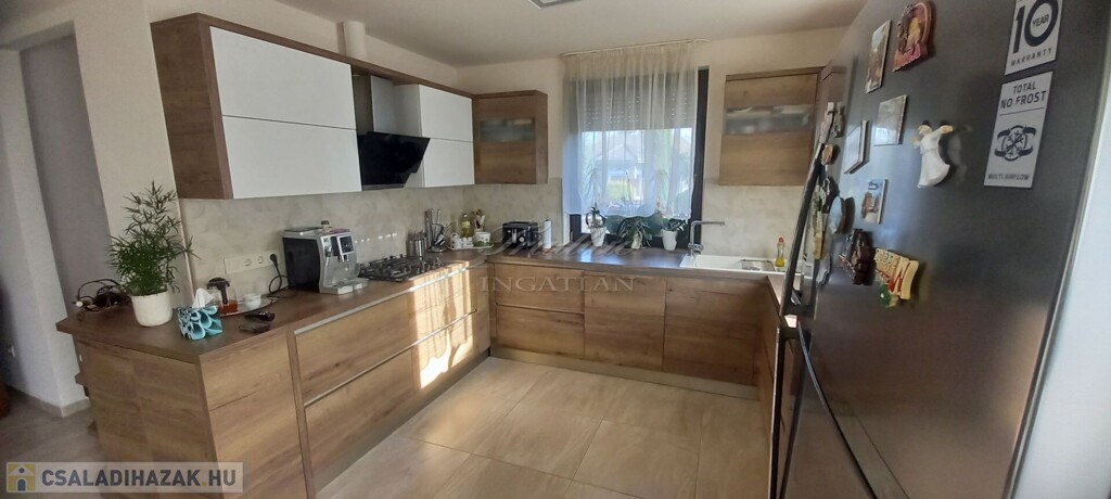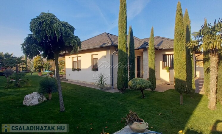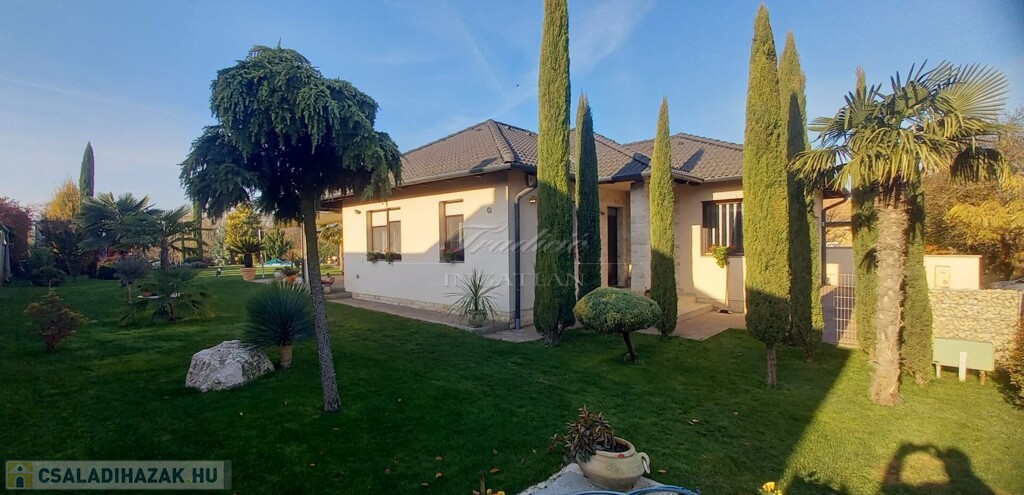 Győr kedvelt kertvárosi részén, Ménfőcsanak csendes, forgalom mentes mellékutcájában kínálom eladásra ezt a gyönyörűen parkosított 1830 m2-es telken lévő, nappali + 3 hálószobás, újszerű állapotú, 2014-ben téglából épült családi házat.