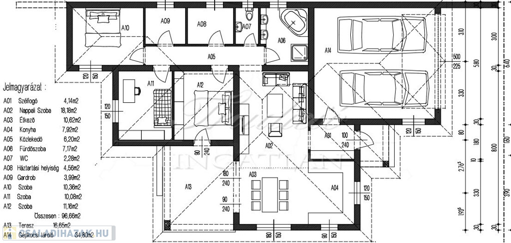 A bruttó 150 m2-es ingatlan nettó 96,66 m2-es lakótérből, 34,80 m2-es két gépjármű kényelmes parkolására alkalmas garázsból és egy fényben úszó, 18,66 m2-es teraszból áll.