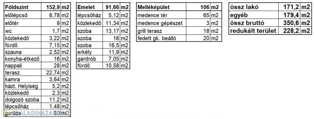 Az ingatlan alaprajzai és helyiséglistája a fotók között található, amiből látható az átgondolt térszervezés. A földszinten a nappalin - ahonnan a földszinti fedett teraszra érkezünk - és az étkező-konyhán kívül, amik egy légteret alkotnak egy lakószoba kapott helyet. Az említett szauna a zuhanyzós fürdő szobában található. A földszinten egy önálló és egy a mosókonyhában elhelyezkedő wc található.
