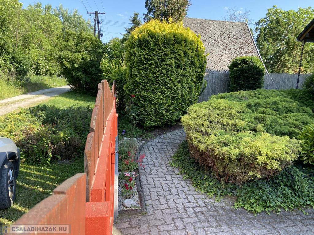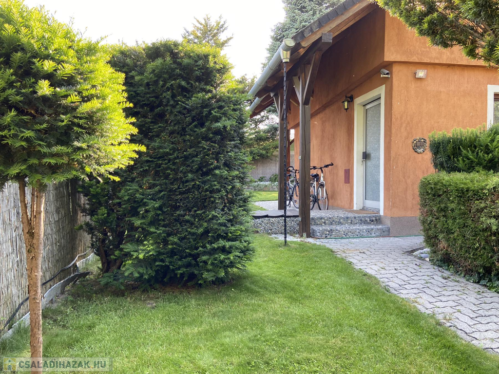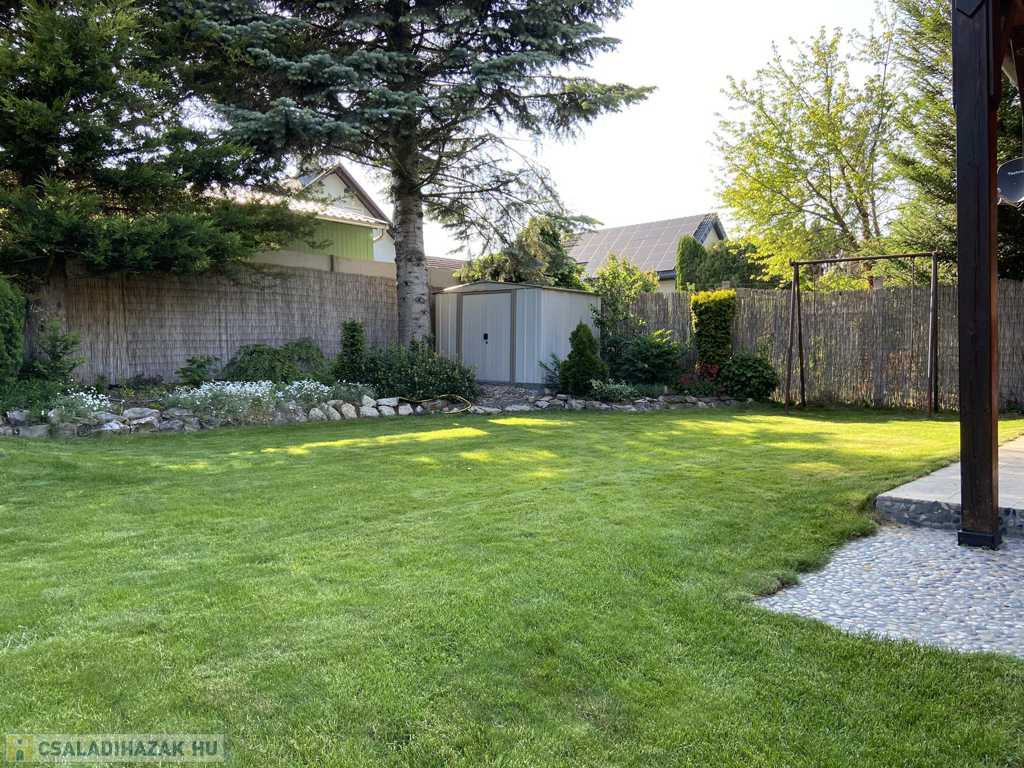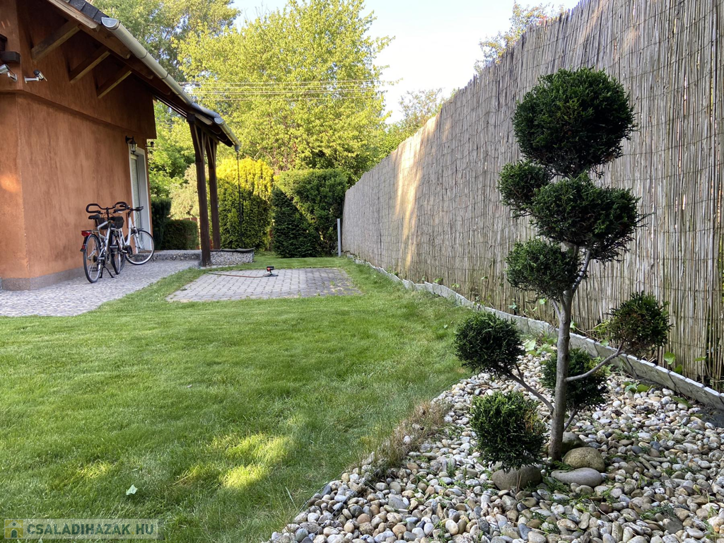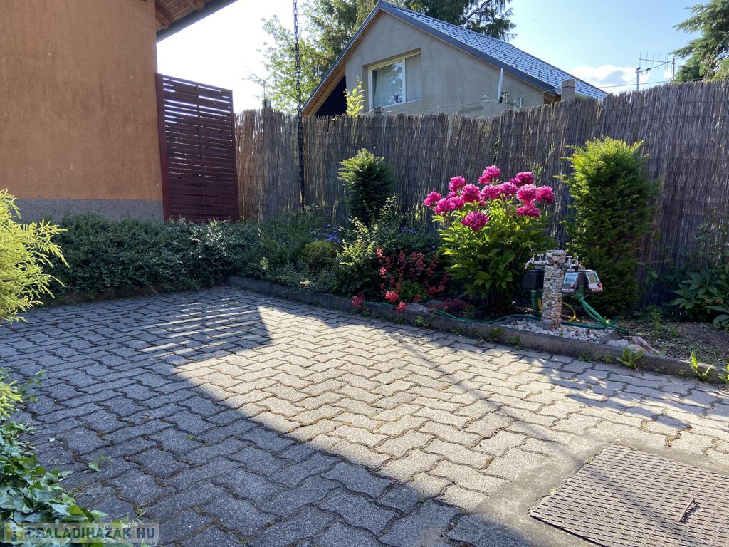 A gyönyörűen karbantartott, parkosított 311 m2-es, 40-50 éves fákkal, virágokkal, vakondhálóval, automata öntözőrendszerrel, robotfűnyíróval rendelkező telken a ház mellett egy 6 m2-es kerti tároló, grillező, valamint egy térkövezett rész is helyet kapott, ami ideális medence, vagy jakuzzi elhelyezése. A térkövezett gépkocsibeálló az előkertben található.