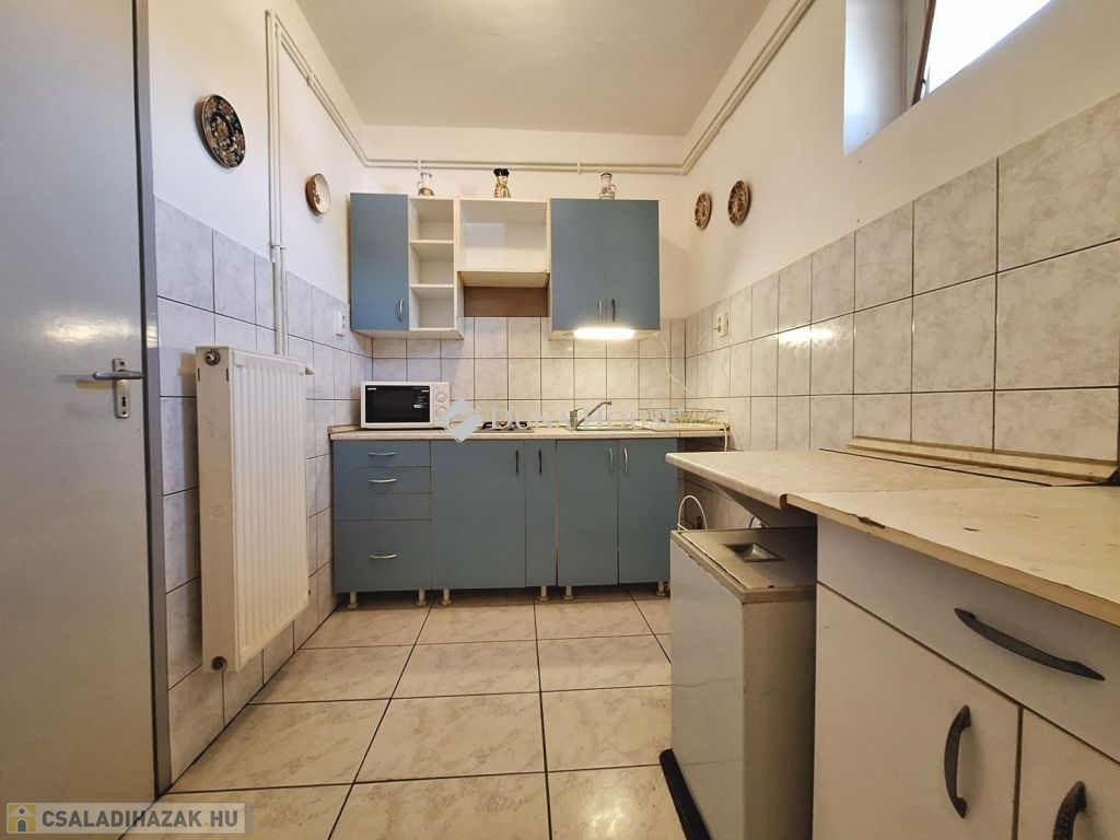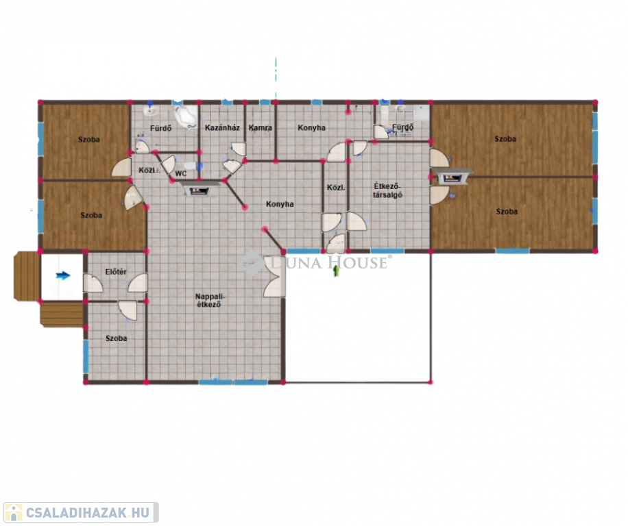 - hátsó rész: előszoba, közlekedő, konyha, étkező, 2 szoba, fürdőszoba