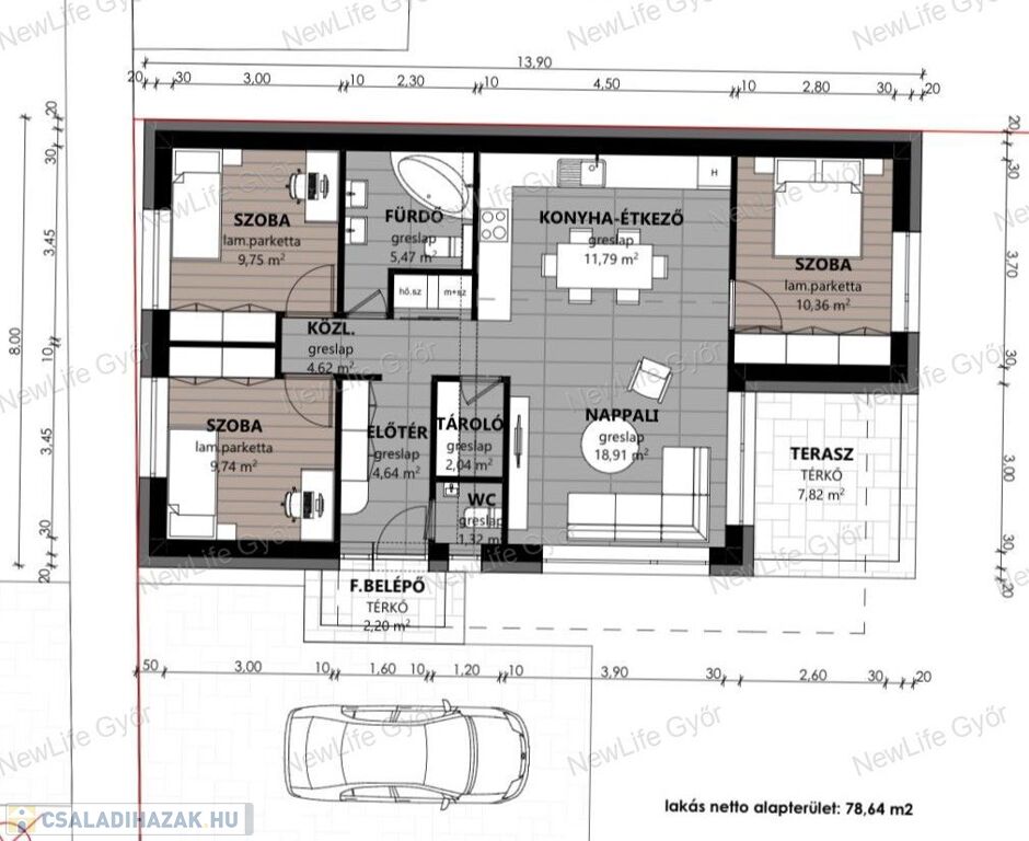 Győr egyik kedvelt, nyugodt részén ajánlom megvételre ezt a 78,64 m² hasznos alapterületű, modern elosztású családi házat.