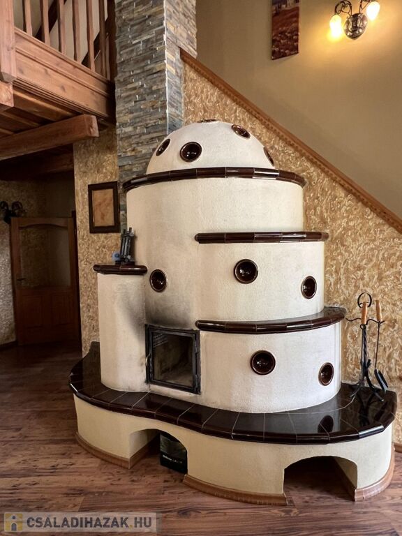 A nappaliban alternatív fűtési lehetőségként szemet gyönyörködtető és kiválóan működő cserépkályha található.