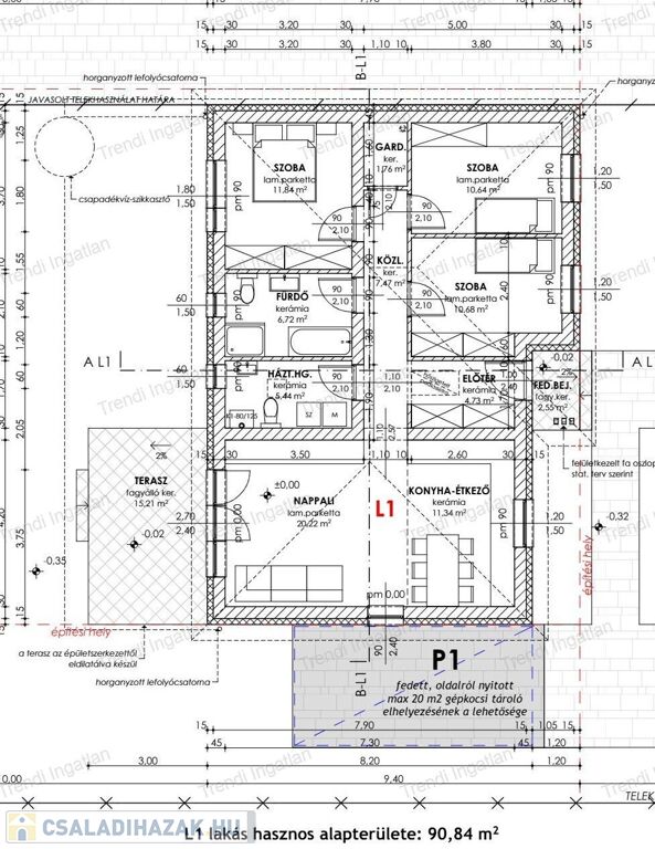 A remek elosztású házban amerikai konyhás nappali, 3 szoba, fürdőszoba, háztartási helyiség, előtér, gardrób, közlekedő található. A nappaliból 15,21 nm-es terasz nyílik.