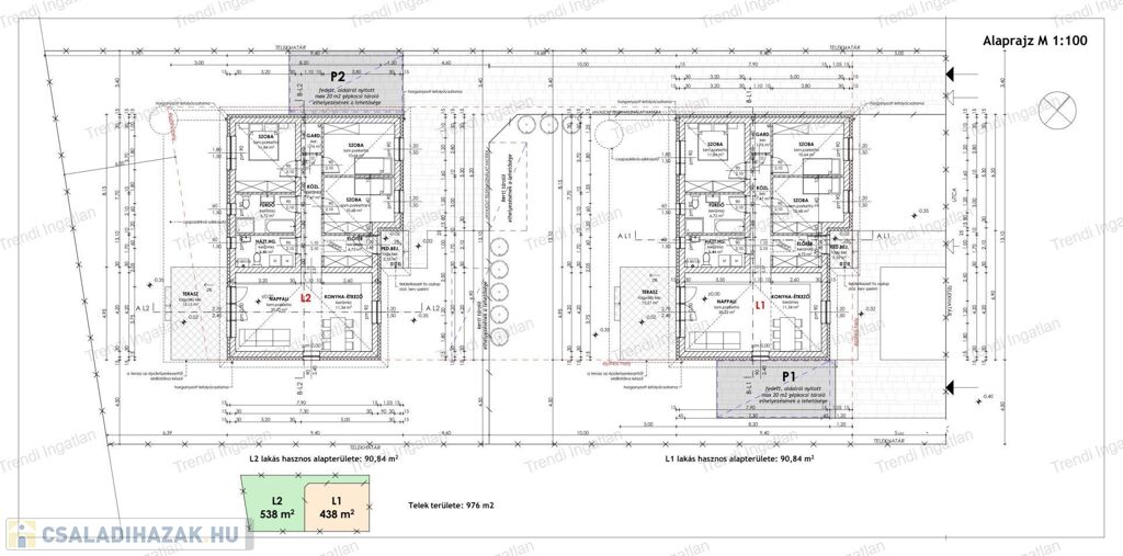 Győrság új építésű részén 90,84 nm-es nappali + 3 szobás ikerház 438 nm-es telekrészen eladó. A két ház önállóan megközelíthető, nincs közös fal.