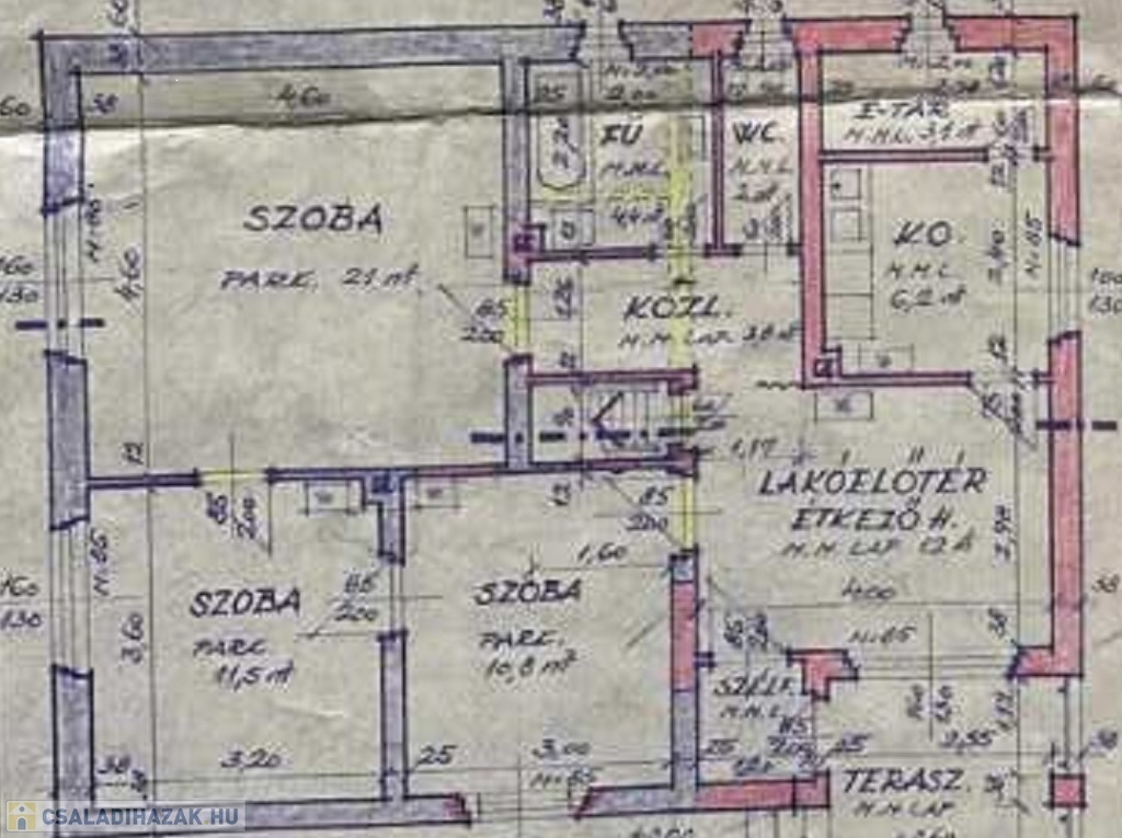 3 szoba, étkező, konyha, spejz, fürdőszoba, kazánház (vegyestüzelésű kazánnal), utólag beépített veranda került kialakításra.
