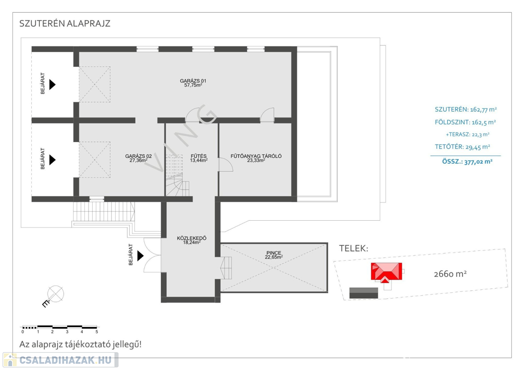 A 3 szintes 377 m2-es ház 2660 m²-es telken található.