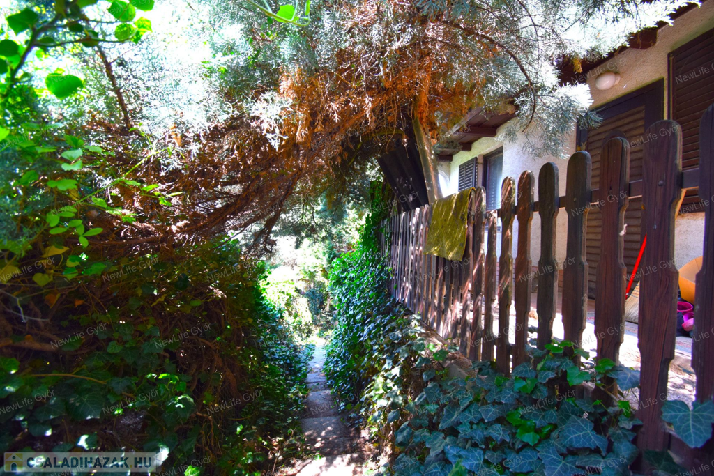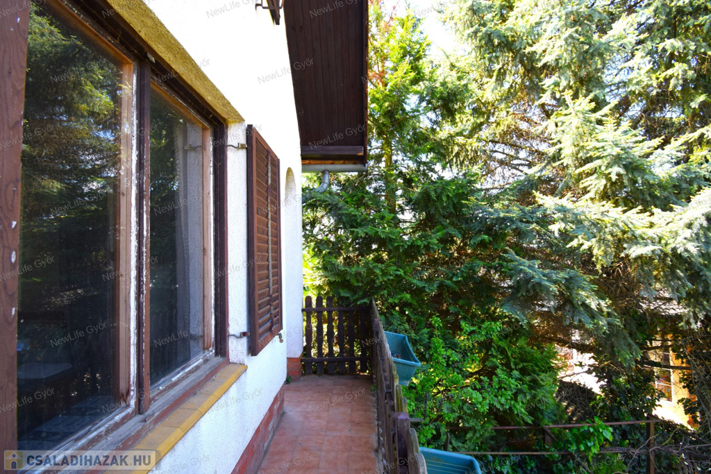 Győrújbarát és Ménfőcsanak határán fekvő, felfelé emelkedő telken helyezkedik el ez a három szintes kis ház buja növényzet ölelésében.