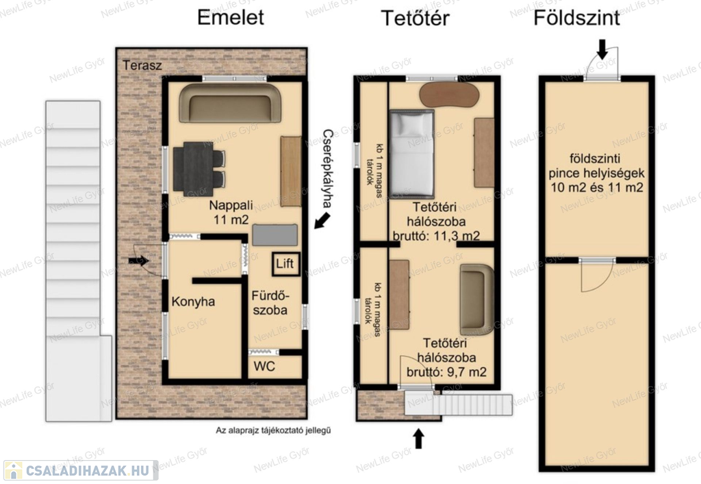 A ház méretei (fotók között alaprajz): pinceszint: 21 m2, emelet: 20 m2 + terasz, erkély, tetőtér: 21 m2. Redukált terület: kb. 50 m2.