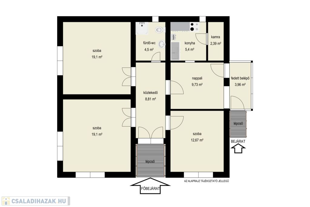 Az ingatlan elosztása: 3 szoba, konyha, kamra, étkező, fürdőszoba-wc, folyosó kialakítású.