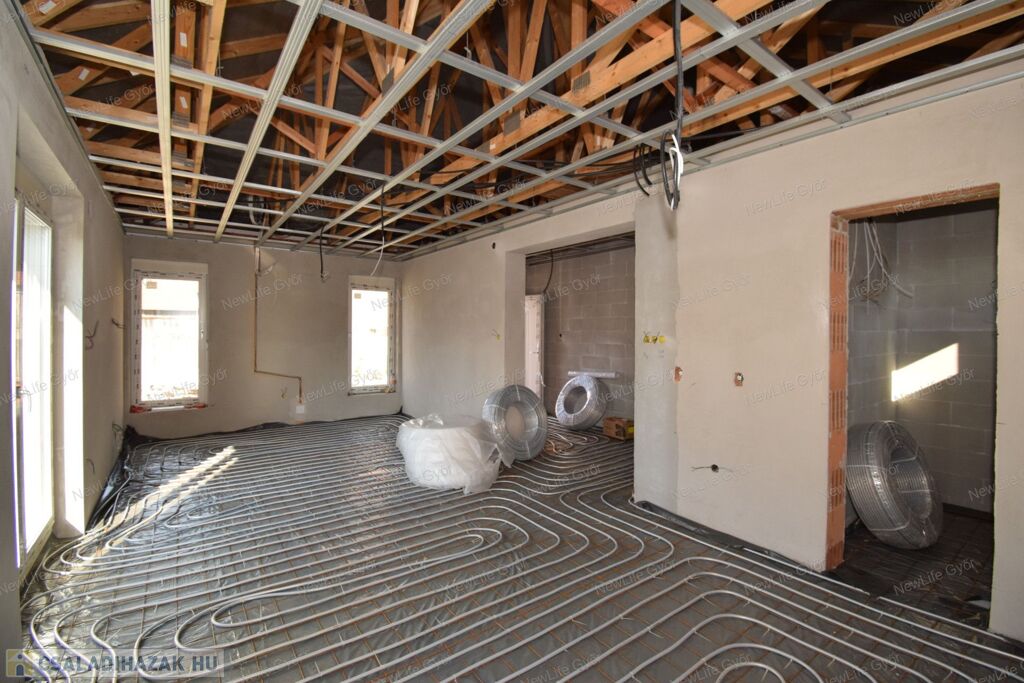 A fűtésről és melegvízellátásról hőszivattyú gondoskodik, hőleadás padlófűtésen keresztül történik.