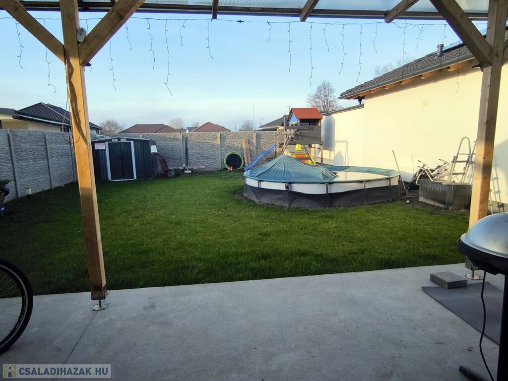 A kert hátsó részén egy kényelmes, jól kihasználható, biztonságos, zárt, füvesített saját kert van, ahol minden gyermekjáték, medence elhelyezhető.