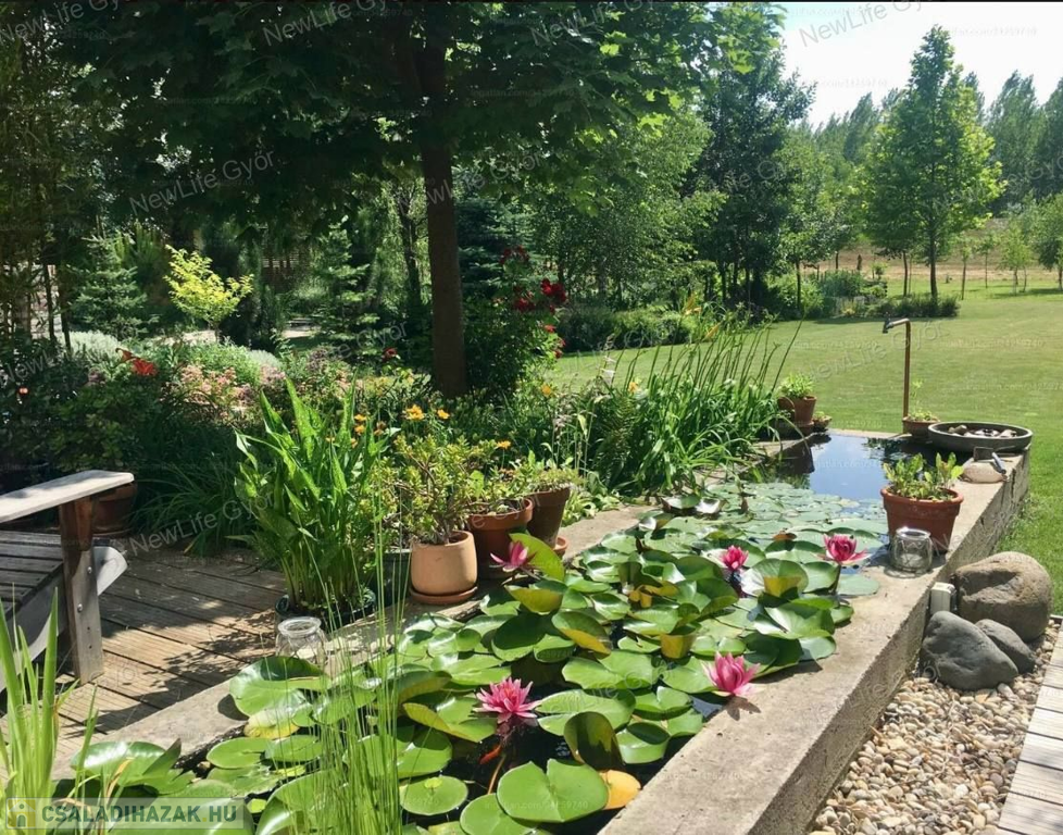 Valamint elkerített kutyaudvar,tüzifa és kuka tároló,dekor medence a hátsó teraszon,magaságyások a kert végében,szép, gondozott kert, nagy méretű fákkal, dús növényzettel, termő gyümölcsfákkal.