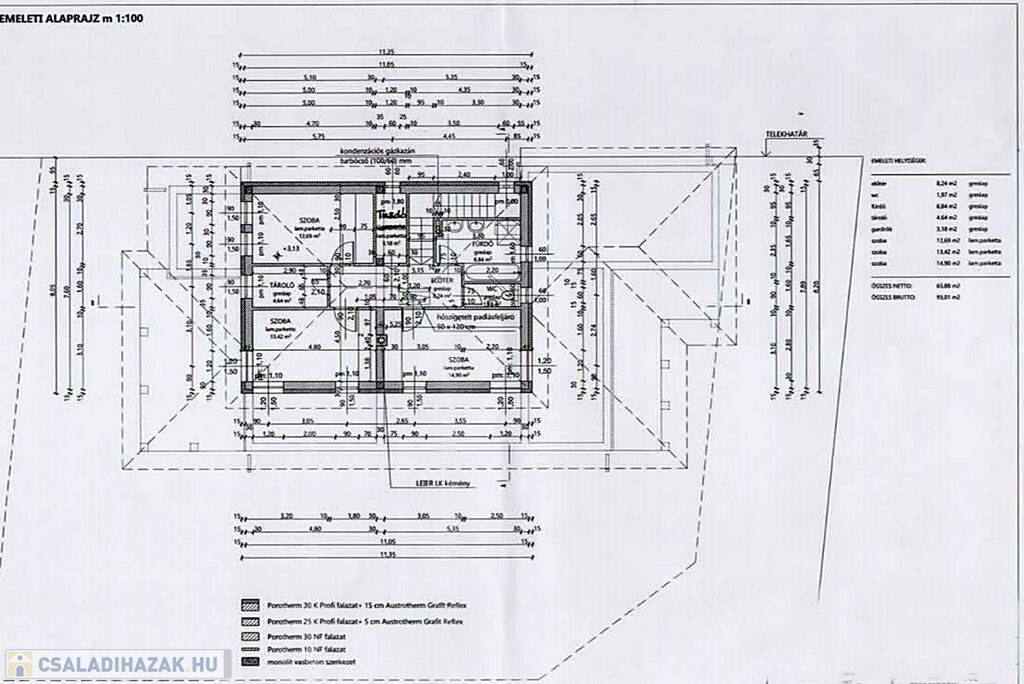 EMELET ( nettó 65,88 m2, bruttó 93,01 m2 ): 3 nagy hálószoba, 2 fürdőszoba, WC, gardrób, közlekedő, lépcső.