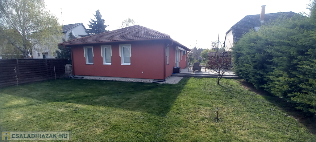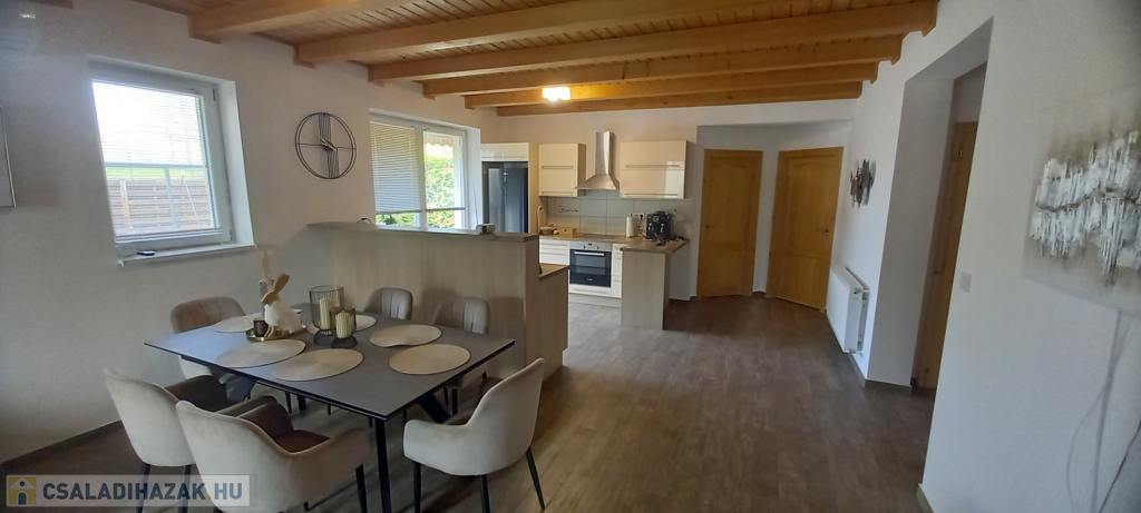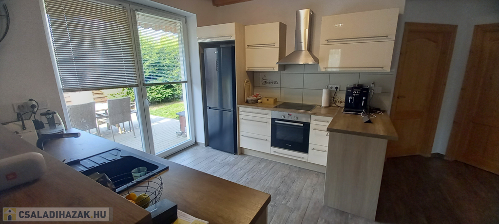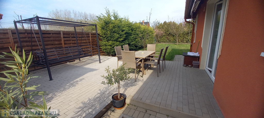 Az egy térben lévő nappali, étkező és az amerikai konyha tágas, világos teret eredményez. A 30 m2-es teraszra és az udvarra a konyhaszigettel is rendelkező konyhából tudunk kijutni. A szépen parkosított, térkövezett telken a családi ház mellett 2 db fából készült tároló, valamint egy kerti grillező is helyet kapott.