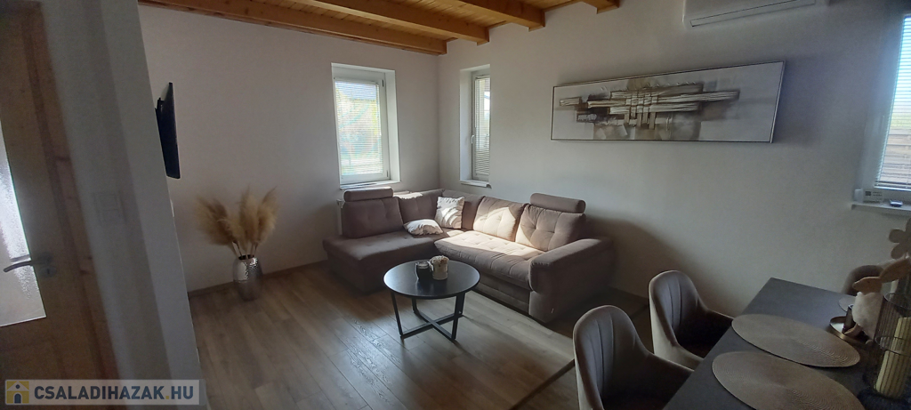Az ingatlanba érkezve egyből érezni a jó minőséget és az ízléses anyagválasztást, a ház esztétikus fa álmennyezete kiválóan passzol a jó minőségű burkolatokhoz.
