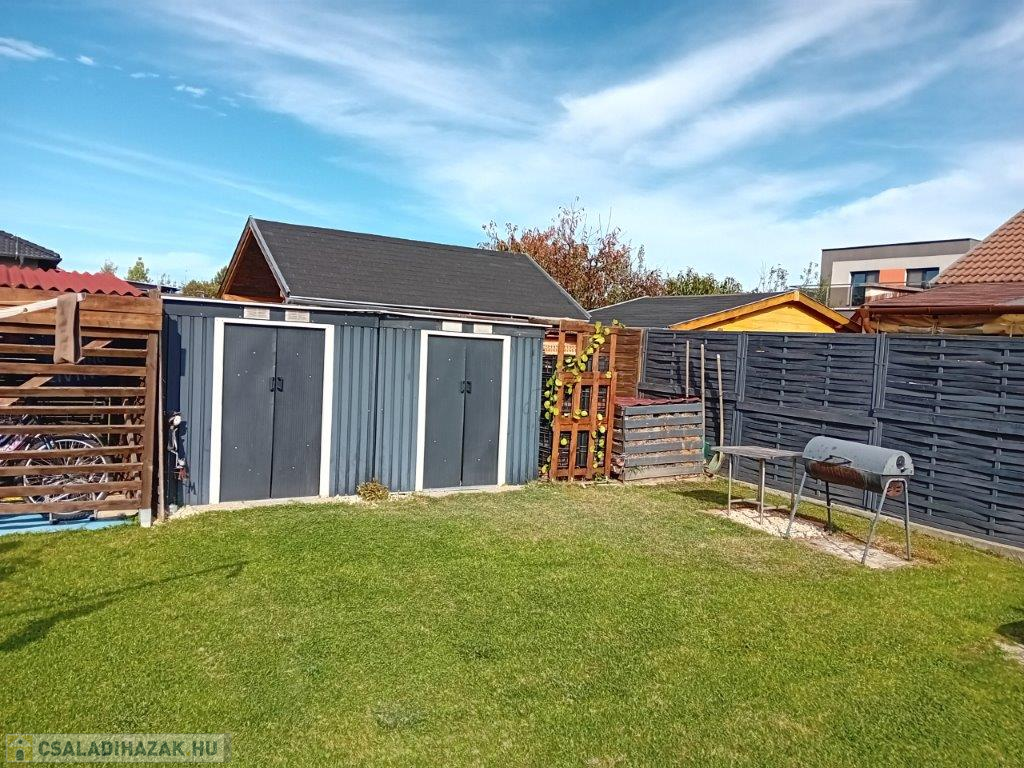 Az ingatlan egy 655 m2-es, szépen karbantartott, füvesített telken helyezkedik el, ahol a ház mellett még két darab kerti tároló is helyet kapott. A ház előtt egy tágas parkoló lett kialakítva, ahol több gépkocsi kényelmes parkolása is megoldható.