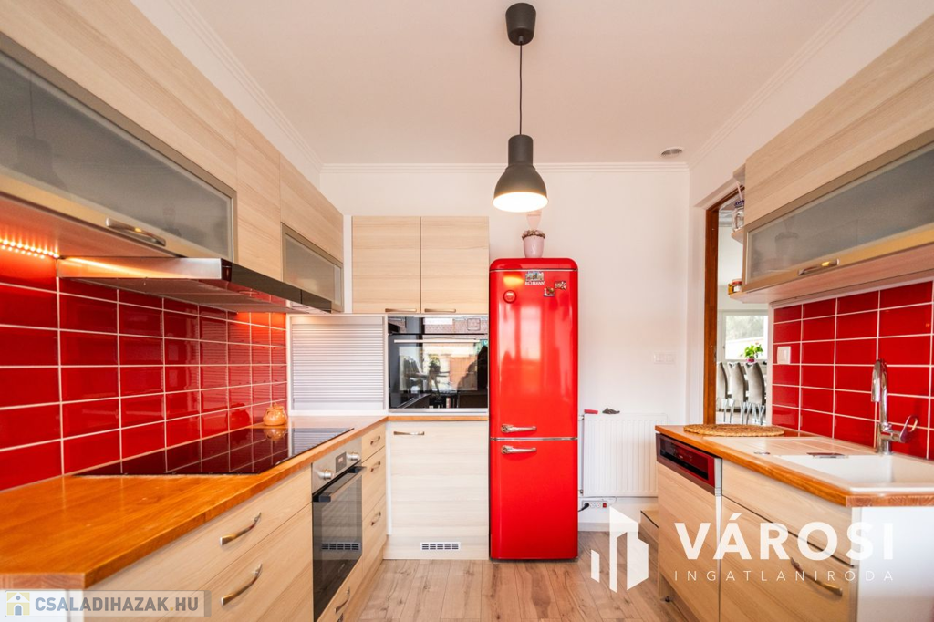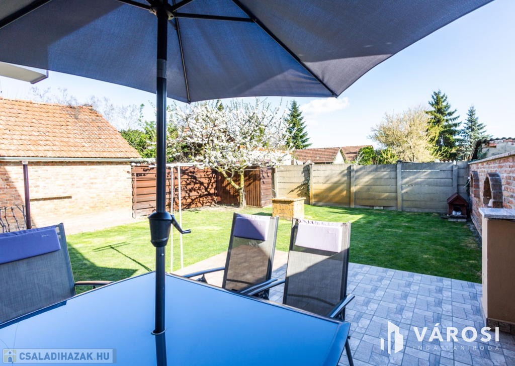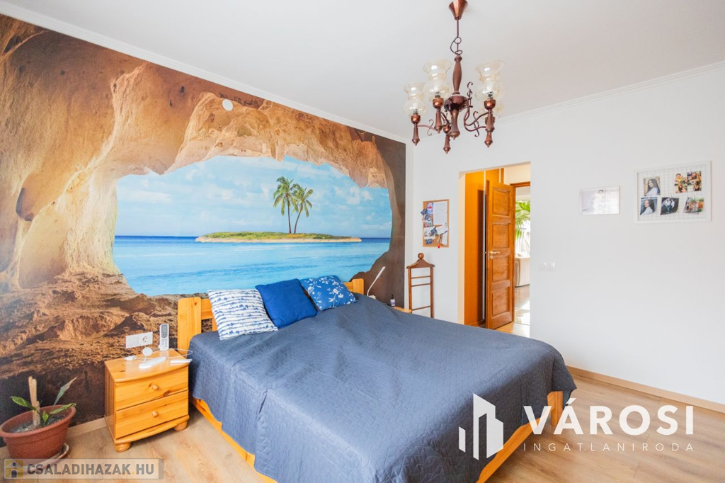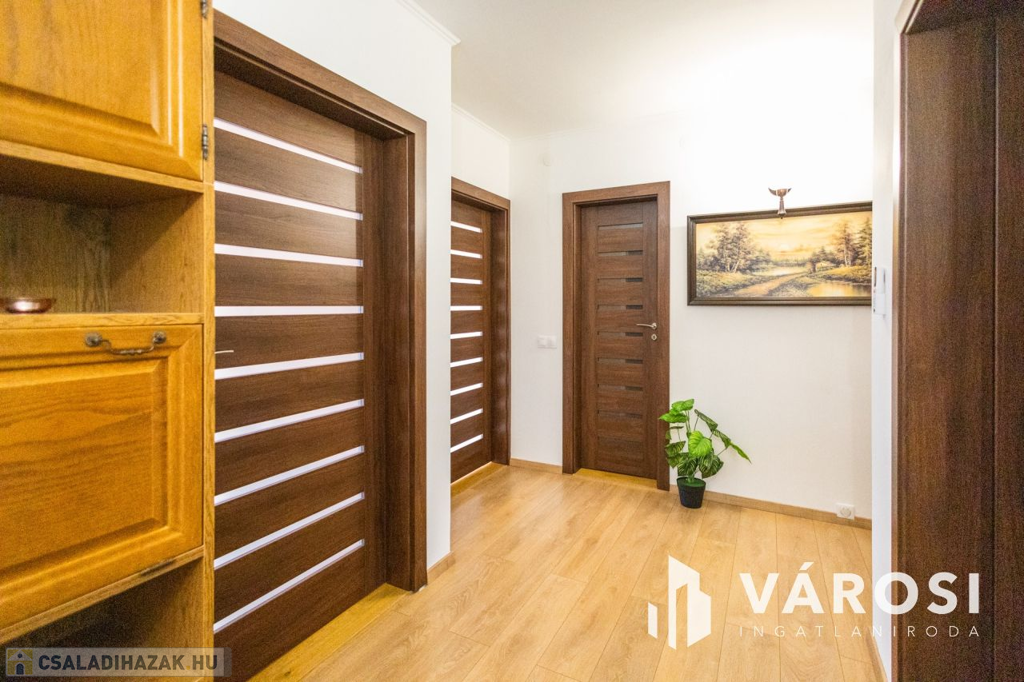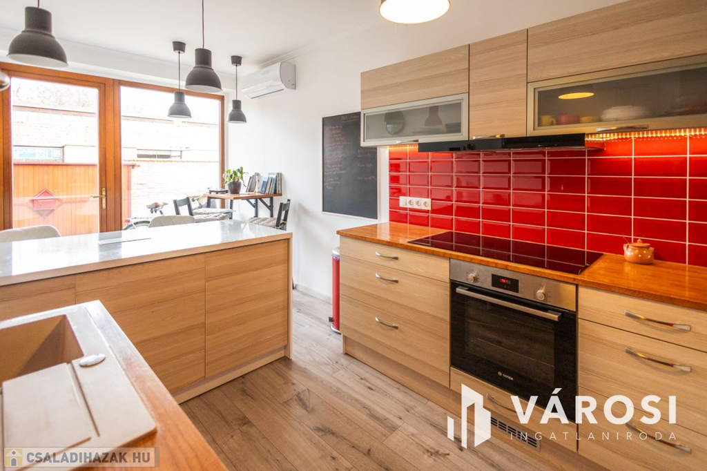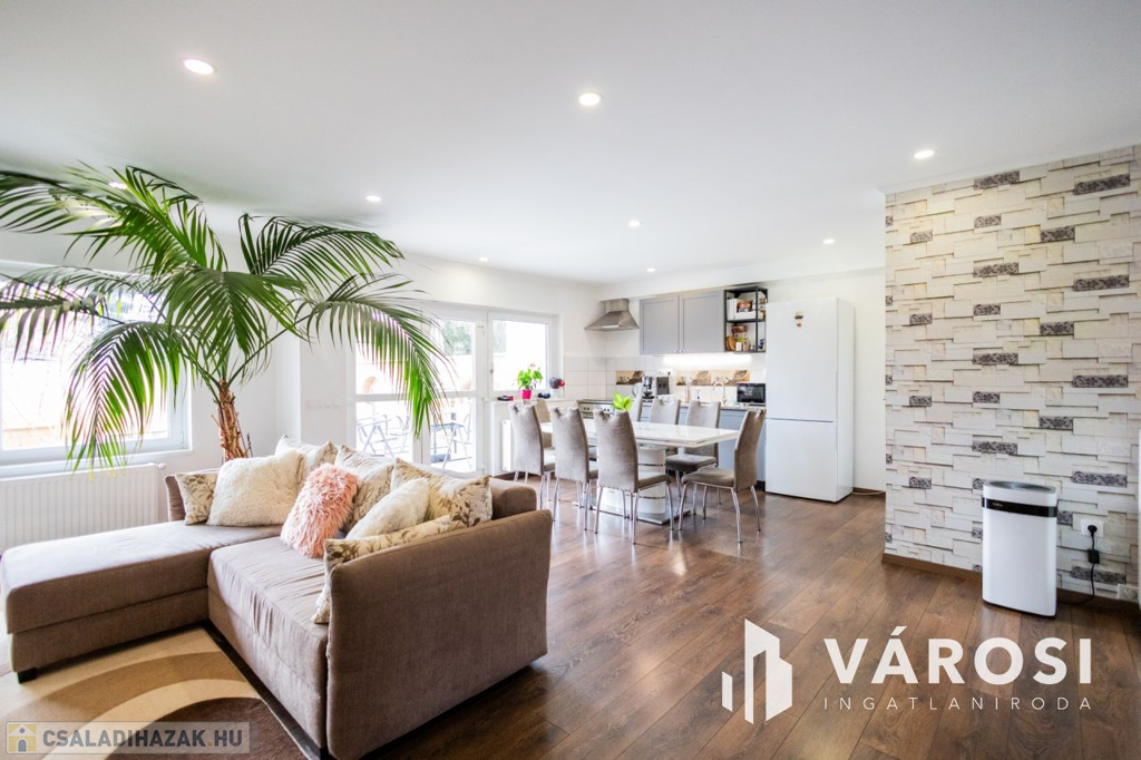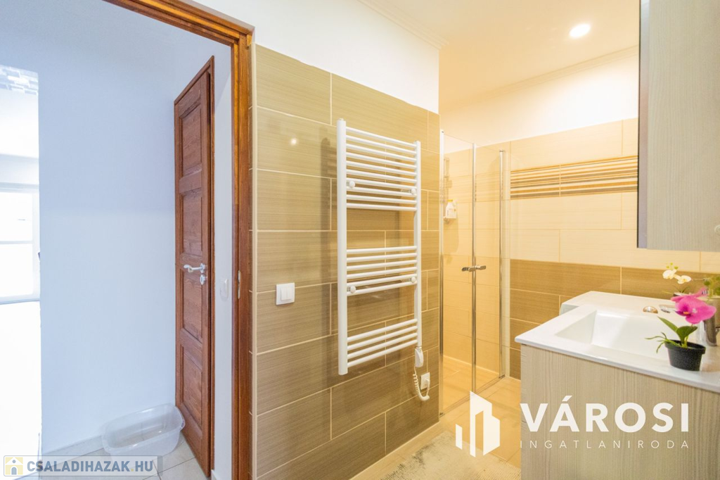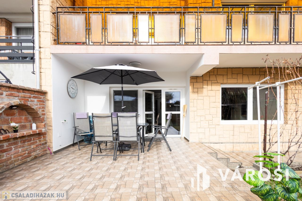 Gyula belvárosában, mindenhez közel eladóvá vált egy 207 nm alapterületű, felújított ikerház. Az ingatlan két szintes és különlegessége, hogy az amerikai konyhás nappali mellett a földszinten található fürdőszoba és hálószoba is, emellett a garázsból is ki lett alakítva egy tágas konyharész is.. Az emeleten további 4 szoba, két tágas loggia és külön fürdő és WC található. A ház tégla falazatú és 2017-ben teljeskörű felújításon esett át, melynek keretében: