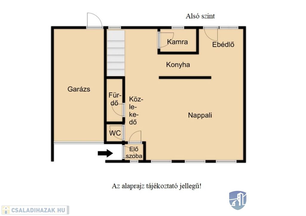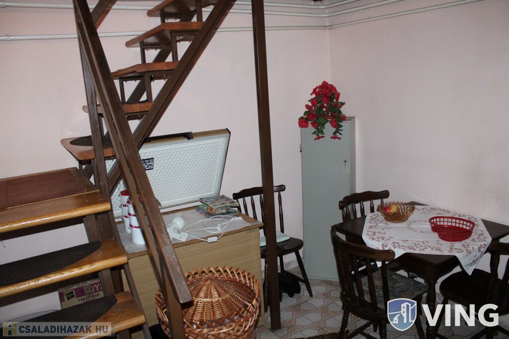Az alsó szinten egy tágas nappali található, közlekedő, konyha, kamra, étkező, külön álló wc valamint fürdőszoba is.