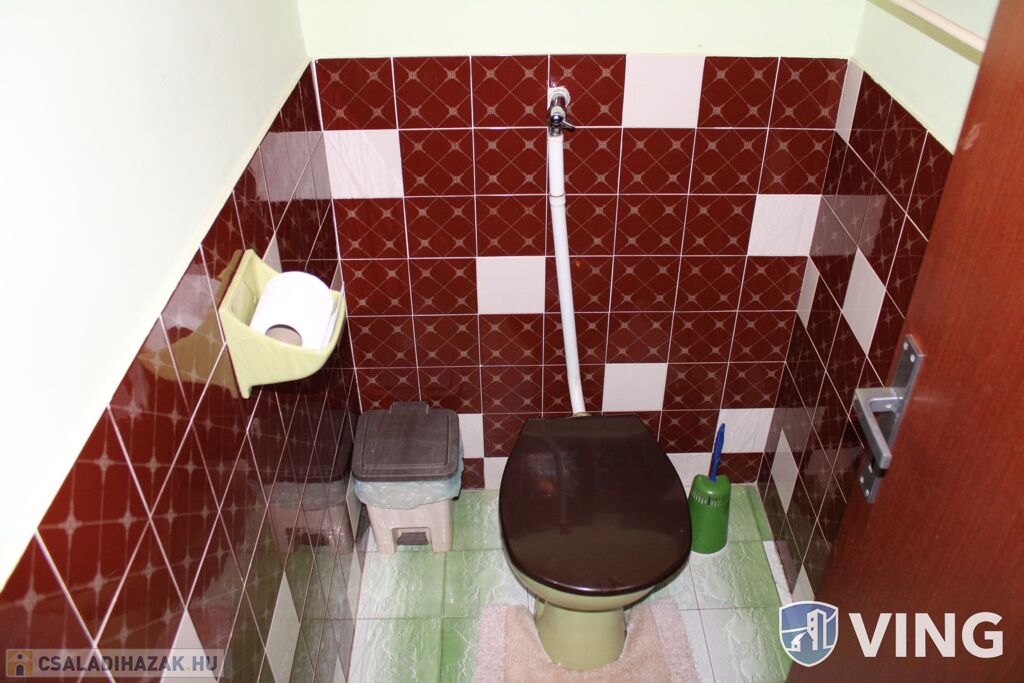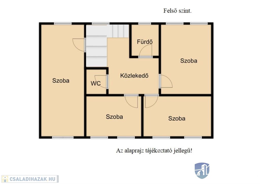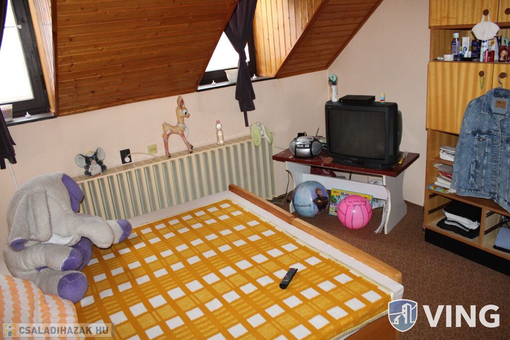A felső szinten 4 tágas szoba -melyből az egyik külön légterű, különálló fürdő és wc valamint egy közlekedő található.