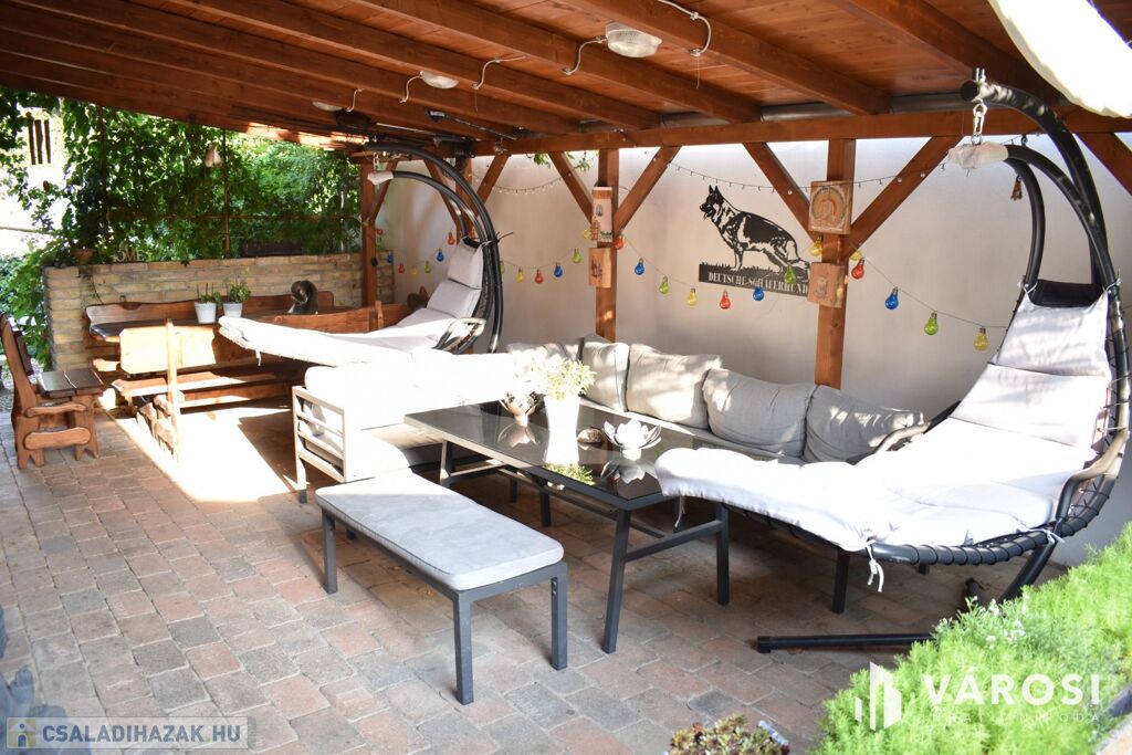 Az ingatlanhoz tartozik egy 501 m2-es teljesen körbekerített, parkosított udvar is, ahol egy hatalmas és hangulatos fedett terasz lett kialakítva. A kertben lévő növények locsolása szinte költségmentesen egy fúrt kút segítségével elvégezhető.
