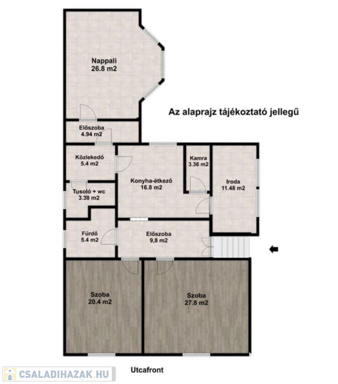 A helyiségek: előszobából két, méretes szoba nyílik, egy kádas fürdő, és a konyha-étkező. Innen érhetőek el a további helyiségek - az egyik irányban egy tusolós fürdő, és a kertre néző nappali, a másik irányban a kamra és egy jelenleg irodaként használt helyiség található.