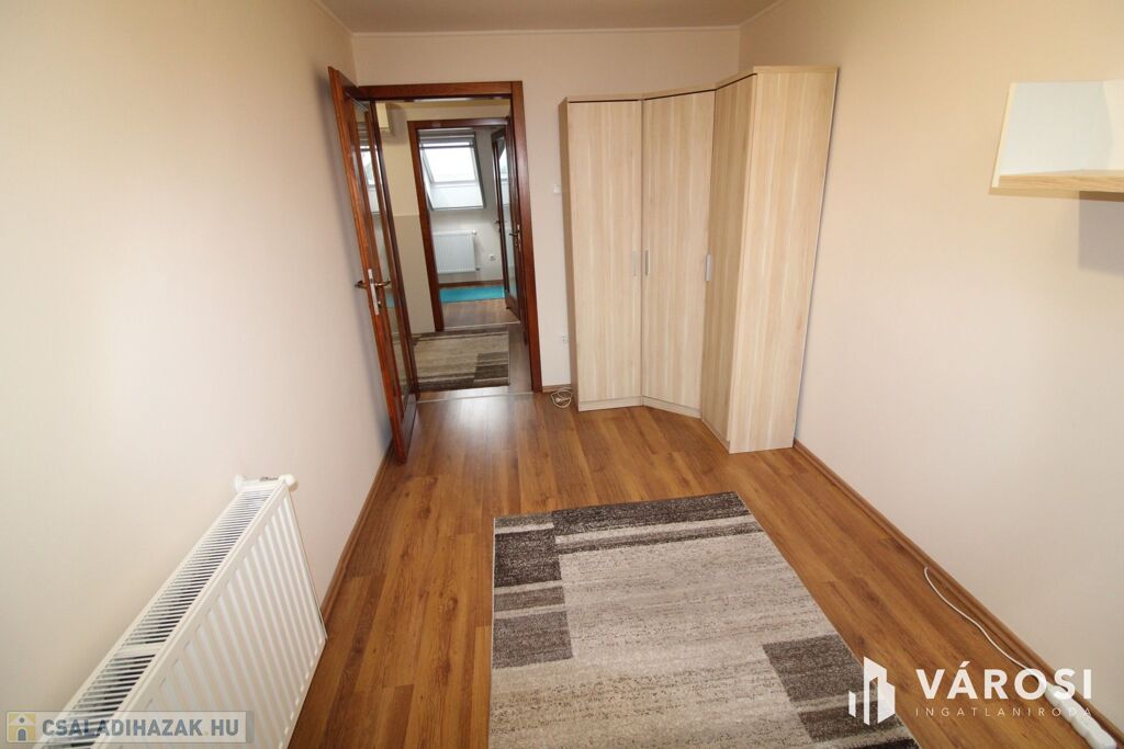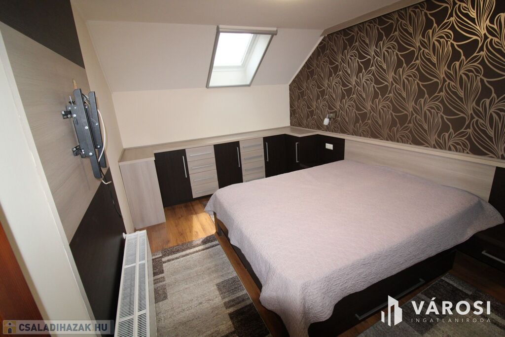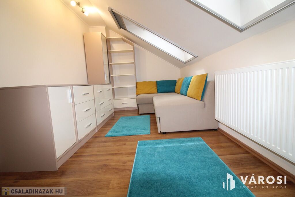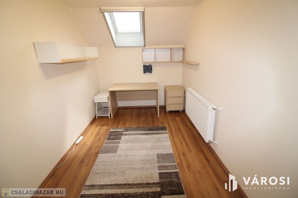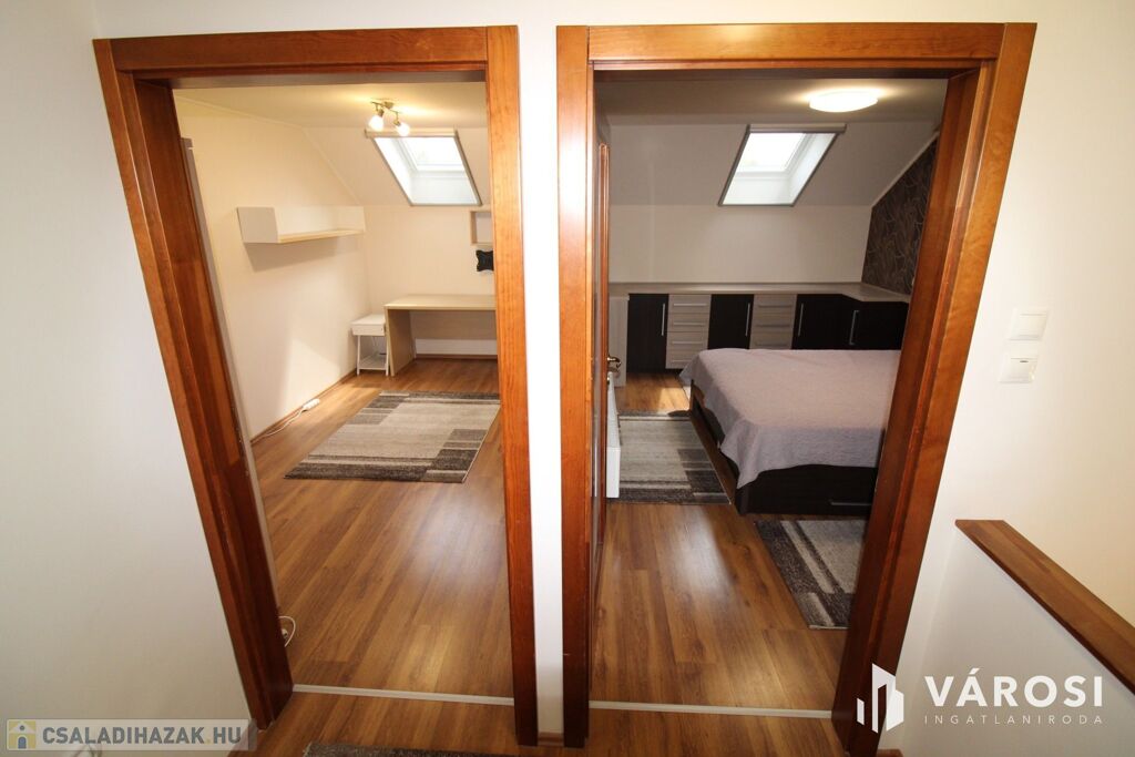 A felső szinten hálószoba, dolgozószoba és gyermekszoba valamint fürdő+WC helyezkedik el.