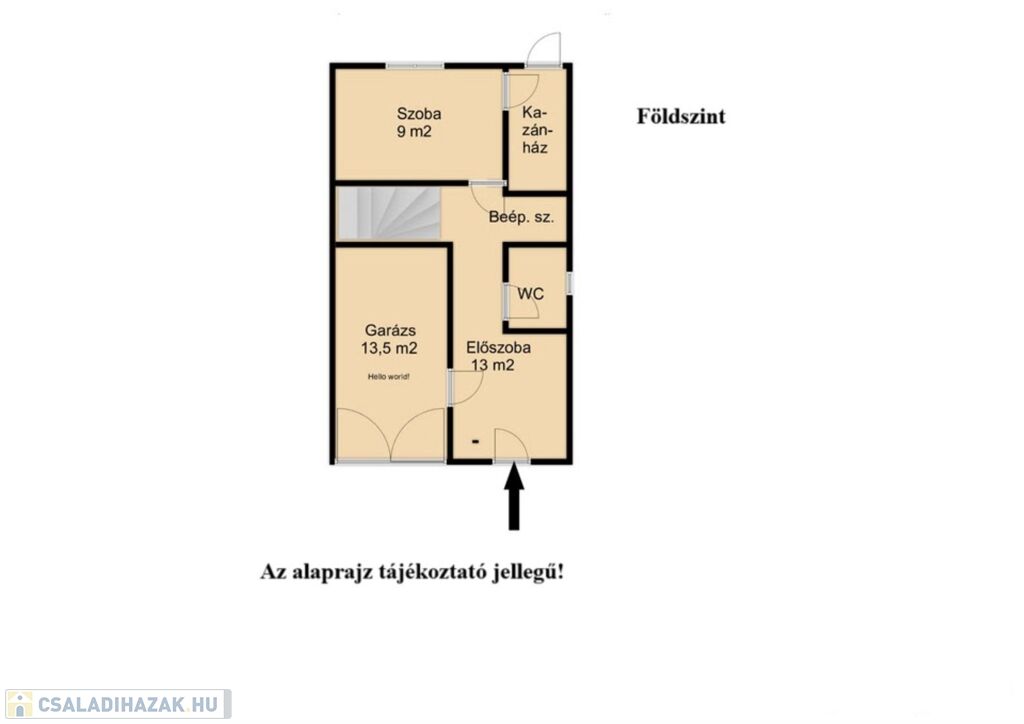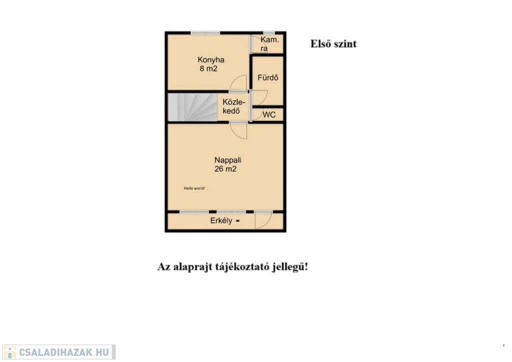 Az első szinten tágas nappali, erkély, konyha, kamra, fürdő+WC.