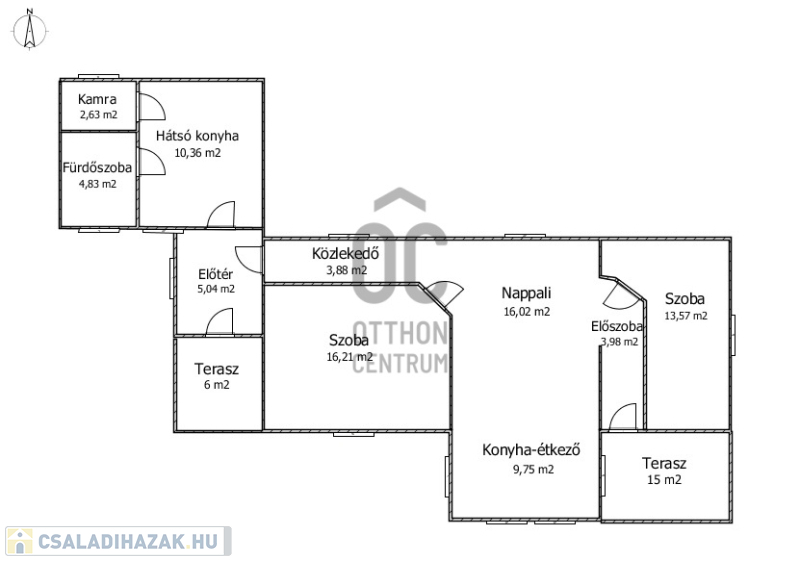 A házban két tágas szoba (16,21 m² és 13,57 m²), valamint egy nagy, világos, 25,77 m²-es konyha–étkező–nappali került kialakításra. Emellett található egy hátsó konyha (10,36 m²), fürdőszoba (4,83 m²) és kamra is, így a helyiségek elrendezése rendkívül praktikus.