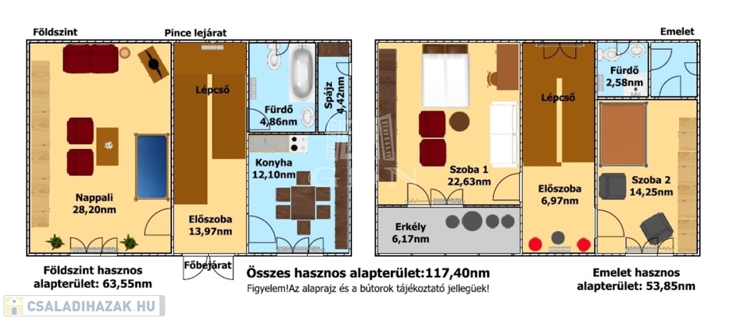 A főépület hasznos alapterülete 63,55+53,85= 117,40nm, melyben található: