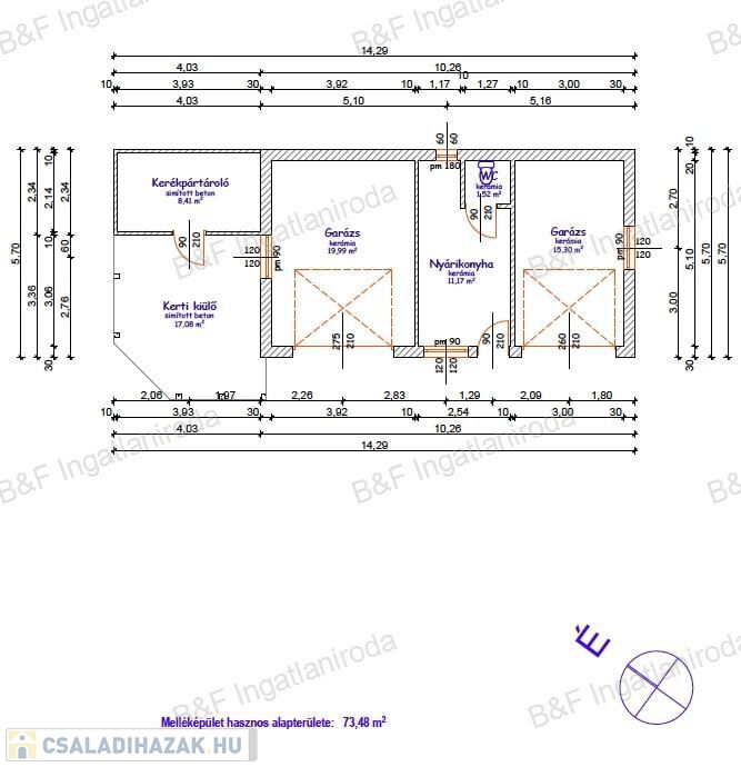 A 73 m²-es melléképület két garázst, nyárikonyhát, kerékpártárolót, WC-t és 17 m²-es fedett kerti kiülőt tartalmaz — akár vendégháznak vagy második lakrésznek is átalakítható.