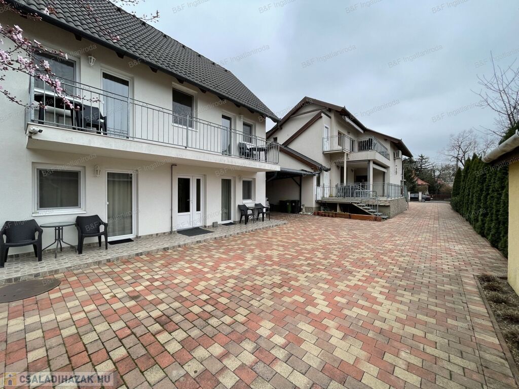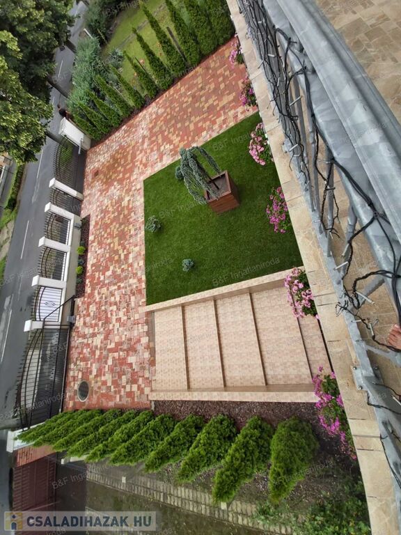 Az udvar nagyrészt térkövezett, több autó parkolására ad lehetőséget.