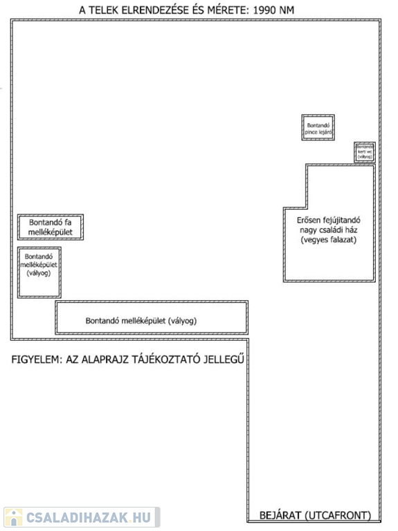 A ház állapotából adódóan erősen felújítandó vagy bontandó. Viszont ne feledjük, hogy egy nagy telek áll rendelkezésünkre, ahol a 35 % beépíthetőségi szabálynak köszönhetően megvalósíthatja álmait. Ha több család vagy generáció szeretne ide költözni, akkor a hely mérete bőven engedi ezt (akár ikerház is építhető).