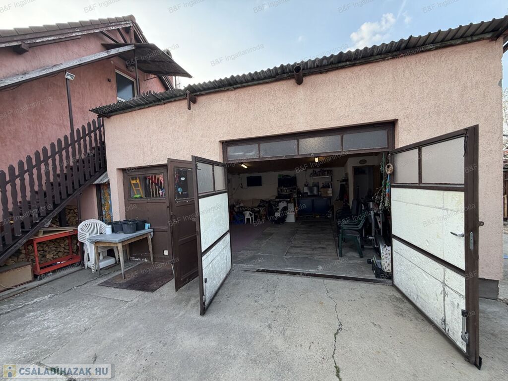A telken található továbbá egy 40 m²-es téglából épült dupla garázs, amely kényelmes parkolást és tárolási lehetőséget kínál, és helyet kapott benne egy wc is.
