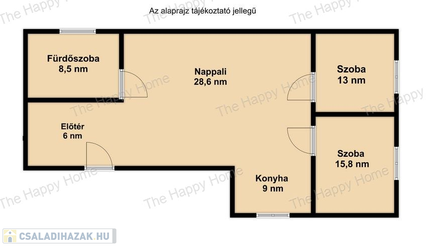 A bejárati ajtón belépve az előtérbe érkezünk, ahol elegendő hely van egy nagy gardróbszekrény elhelyezésére. Az előtérből a tágas nappaliba jutunk, ahonnan az egyik oldalon a fürdőszobát, a másik oldalon pedig a két lakószobáz, illetve a konyhát találjuk.