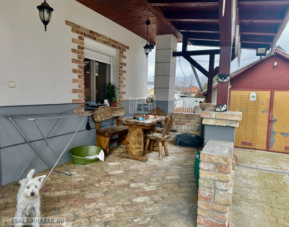 A házba, egy 25 m²-es hangulatos, szeletelt téglával díszített teraszon át jutunk be, ami tökéletes helyszín a pihenéshez és a baráti összejövetelekhez. Az ingatlan riasztó- és kamerarendszerrel ellátott.