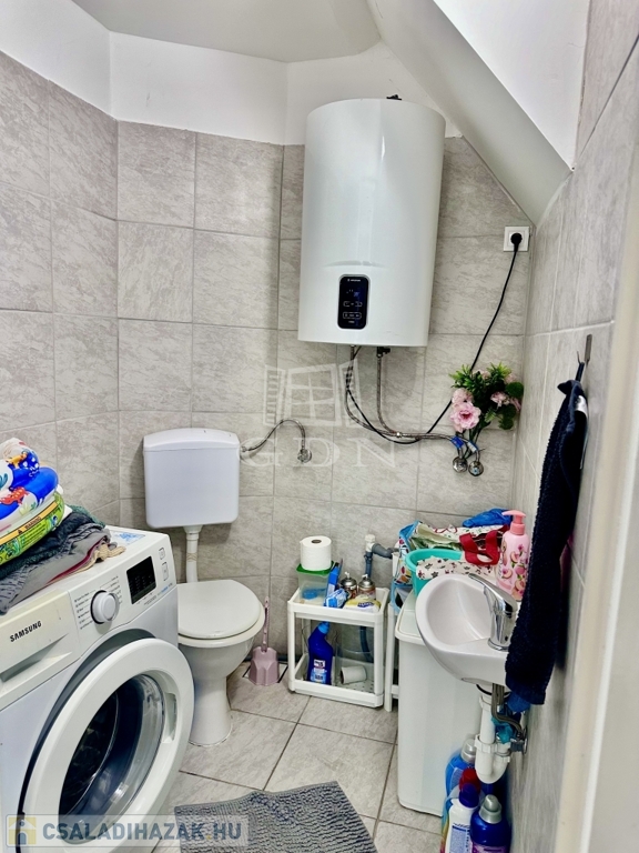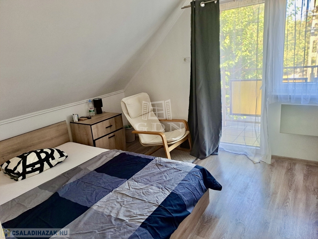 Az első lakrészbe belépve egy tágas, beépített konyhabútoros konyha étkezővel fogad minket! Innen nyílik egy wc ami háztartási helyiségként is funkciónál, itt található a mosógép, valamint egy korszerű bojler is. Ebből a helyiségből tudunk felmenni a felső szintre. Az emeletre felérve, egy kis nappaliba érkezünk, ahonnan nyílik egy tágas, káddal ellátott fürdőszoba, valamint 2 szoba és egy kis közlekedő. A kisebb szobából egy erkélyre is kiléphetünk.