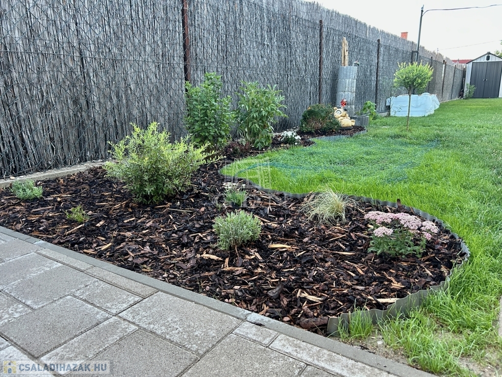Saját telekrésze 445 m² amely szépen parkosított, 3 db. kocsibeállási lehetőséggel, a kertben található egy kisház is amely kb. 5 m²-es.