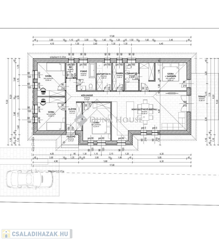 Kialakítása:szoba + gardrób + fürdőszoba, 3 szoba, előtér, nappali+étkező, kamra, háztartási helyiség, fürdőszoba, wc, terasz, fellépő