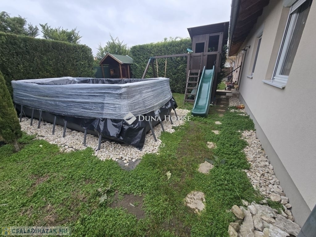 A telek teljes mértékben leválasztásra került, ahol egy 2.86nm-es tároló áll rendelkezésre, illetve egy medence amelynek mérete 6mx275cm. Az ingatlan új építésű ingatlanok között található csendes utcában, autóval iskolától, óvodától, bölcsődétől 5 percre.