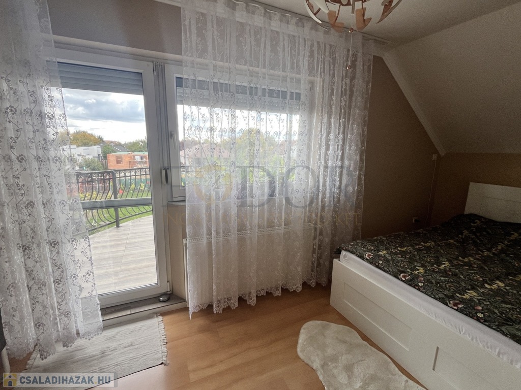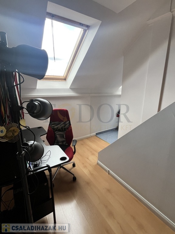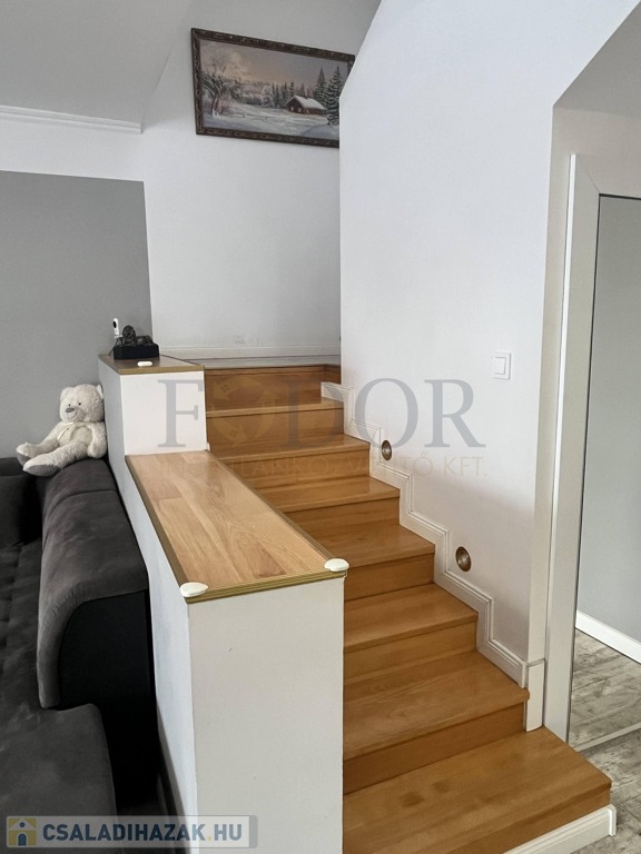 Az emeletre tömörfa lépcső vezet, ahol három hálószoba, egy gardróbszoba, két erkély (egy utcafronti és egy kertre néző), valamint egy nappali pihenősarok kapott helyet. Innen nyílik a beépített tetőtér, amely további szobák kialakítására is alkalmas, jelenleg tárolóként funkcionál.