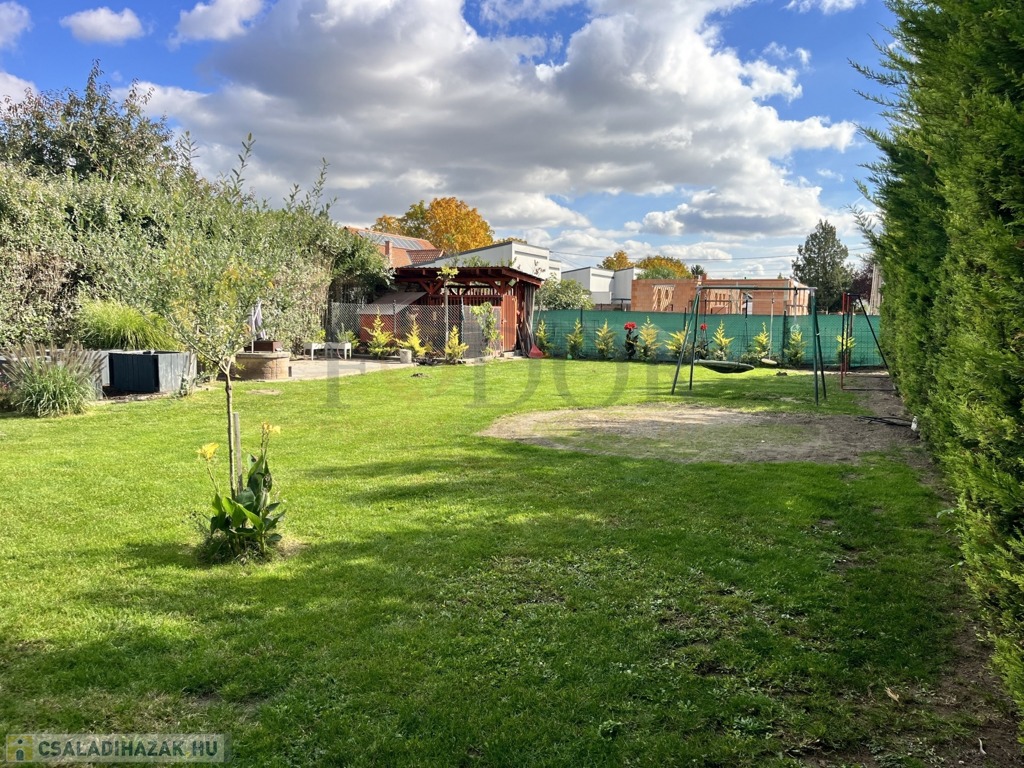 A ház mindkét oldalán autóbeállóval ellátott oldalkert található, az utcafronton rendezett előkert, míg hátul tágas, teljesen intim hátsó kert várja a pihenni vágyókat.