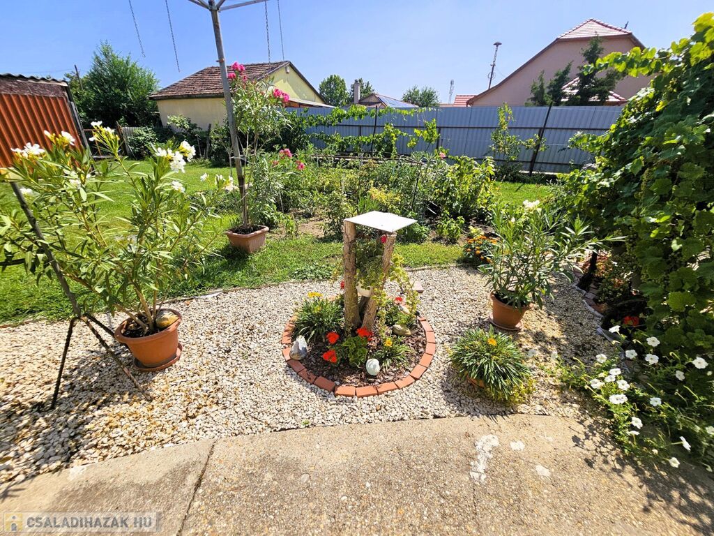 A kert első részen dísznövények, szőlőlugas, hátul konyhakert és 20 termő gyümölcsfa található.