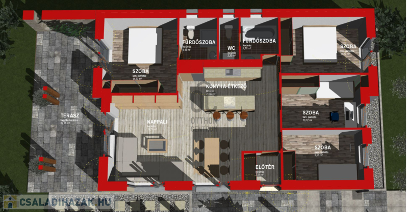 - 3 (vagy akár 4) hálószoba, 2 fürdőszoba, amerikai konyhás nappali, hatalmas terasz